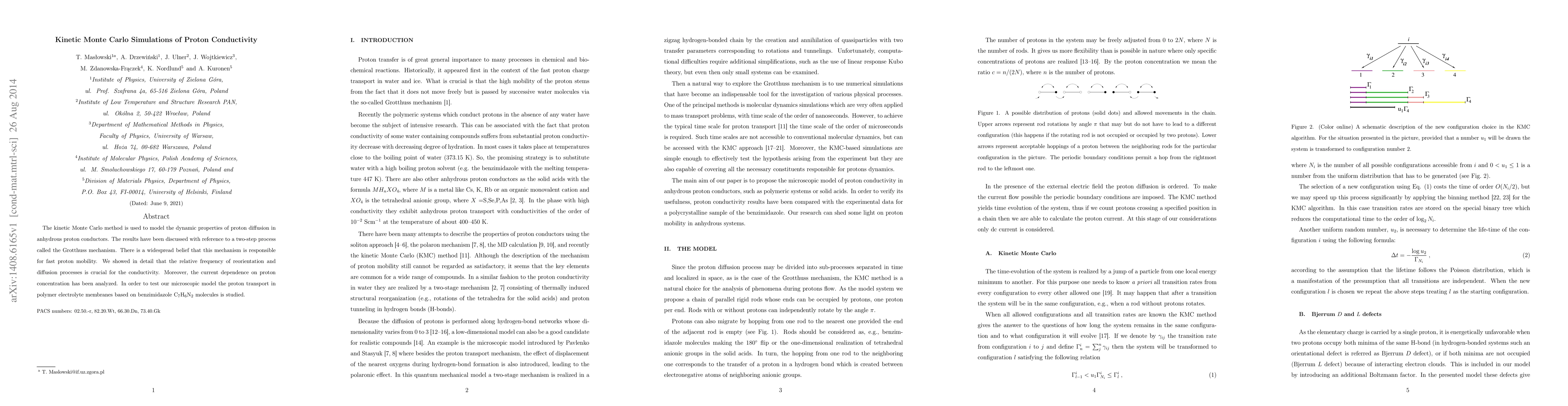 Researchers used kinetic Monte Carlo simulations to study proton diffusion in anhydrous proton conductors, finding that reorientation and diffusion processes affect conductivity, and analyzing the impact of proton concentration on current.