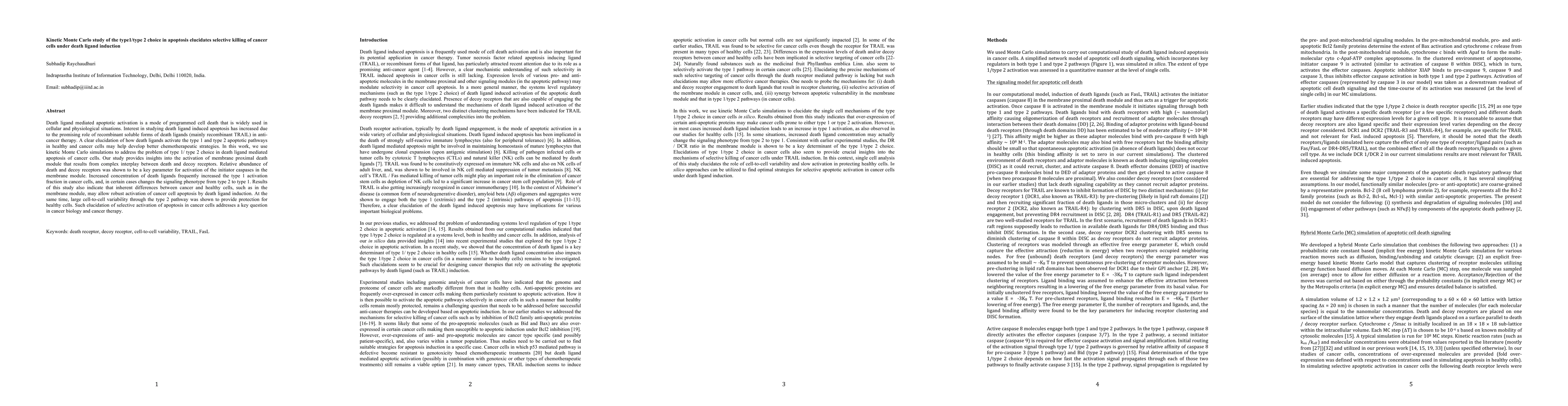 This research uses kinetic Monte Carlo simulations to investigate how death ligands induce apoptosis in cancer cells, distinguishing between type 1 and type 2 apoptotic pathways. The study reveals that the relative abundance of death and decoy receptors is crucial for activating initiator caspases, with higher ligand concentrations often favoring type 1 apoptosis in cancer cells, while healthy cells are protected by variability in the type 2 pathway.
