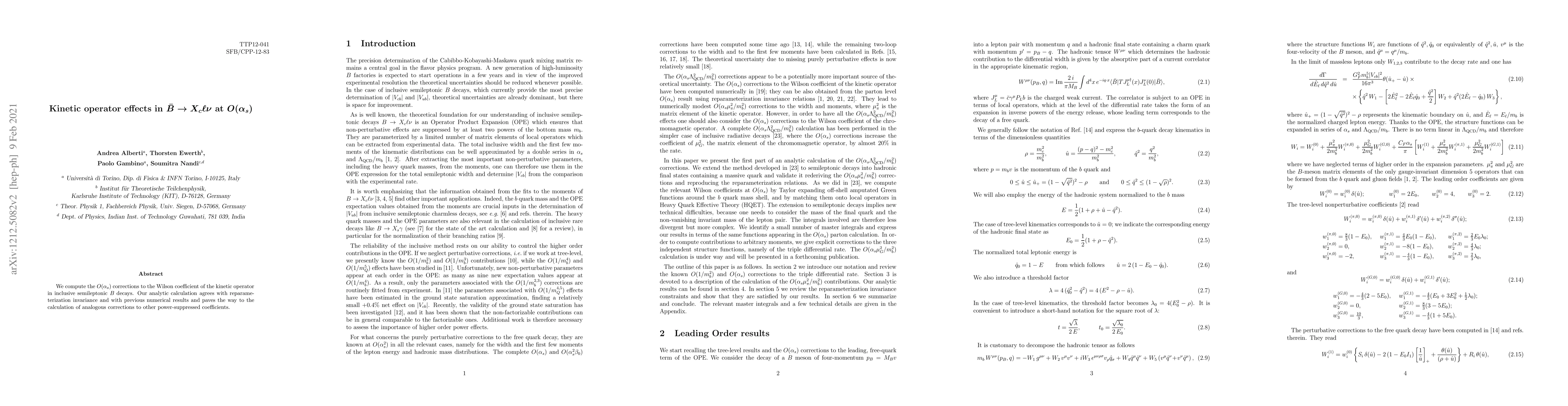 We compute the O(alpha_s) corrections to the Wilson coefficient of the kinetic operator in inclusive semileptonic B decays. Our analytic calculation agrees with reparameterization invariance and with previous numerical results and paves the way to the calculation of analogous corrections to other power-suppressed coefficients.