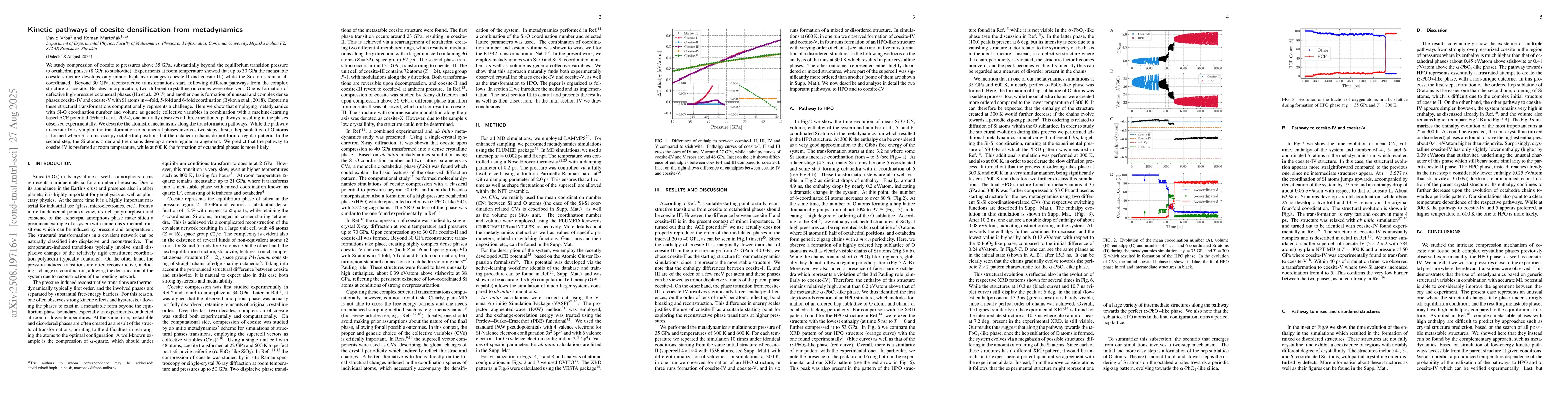 We study compression of coesite to pressures above 35 GPa, substantially beyond the equilibrium transition pressure to octahedral phases (8 GPa to stishovite). Experiments at room temperature showed that up to 30 GPa the metastable coesite structure develops only minor displacive changes (coesite-II and coesite-III) while the Si atoms remain 4-coordinated. Beyond 30 GPa, reconstructive transformations start, following different pathways from the complex structure of coesite. Besides amorphization, two different crystalline outcomes were observed. One is formation of defective high-pressure octahedral phases (Hu et al., 2015) and another one is formation of unusual and complex dense phases coesite-IV and coesite-V with Si atoms in 4-fold, 5-fold and 6-fold coordination (Bykova et al., 2018). Capturing these structural transformations computationally represents a challenge. Here we show that employing metadynamics with Si-O coordination number and volume as generic collective variables in combination with a machine-learning based ACE potential (Erhard et al., 2024), one naturally observes all three mentioned pathways, resulting in the phases observed experimentally. We describe the atomistic mechanisms along the transformation pathways. While the pathway to coesite-IV is simpler, the transformation to octahedral phases involves two steps: first, a hcp sublattice of O atoms is formed where Si atoms occupy octahedral positions but the octahedra chains do not form a regular pattern. In the second step, the Si atoms order and the chains develop a more regular arrangement. We predict that the pathway to coesite-IV is preferred at room temperature, while at 600 K the formation of octahedral phases is more likely.