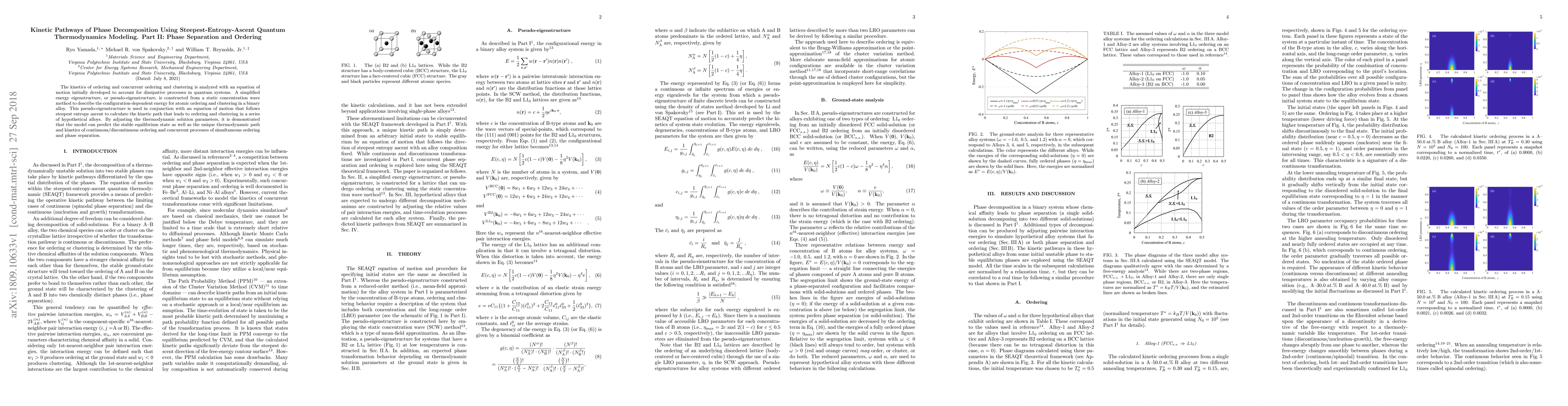This paper investigates the kinetics of atomic ordering and phase separation in binary alloys using a quantum thermodynamics model based on steepest entropy ascent. The model constructs a simplified energy eigenstructure to predict the thermodynamic path and kinetics of continuous and discontinuous ordering processes, alongside simultaneous ordering and phase separation.