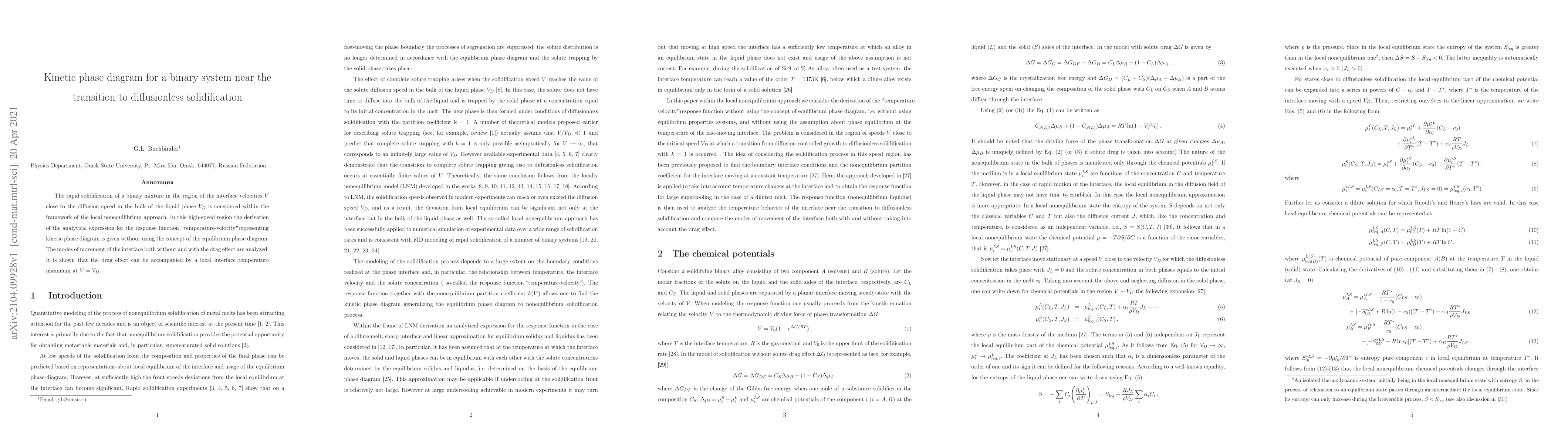 The rapid solidification of a binary mixture in the region of the interface velocities $V$ close to the diffusion speed in the bulk of the liquid phase $V_D$ is considered within the framework of the local nonequilibrium approach. In this high-speed region the derivation of the analytical expression for the response function "temperature-velocity" representing kinetic phase diagram is given without using the concept of the equilibrium phase diagram. The modes of movement of the interface both without and with the drag effect are analyzed. It is shown that the drag effect can be accompanied by a local interface temperature maximum at $V = V_D$.