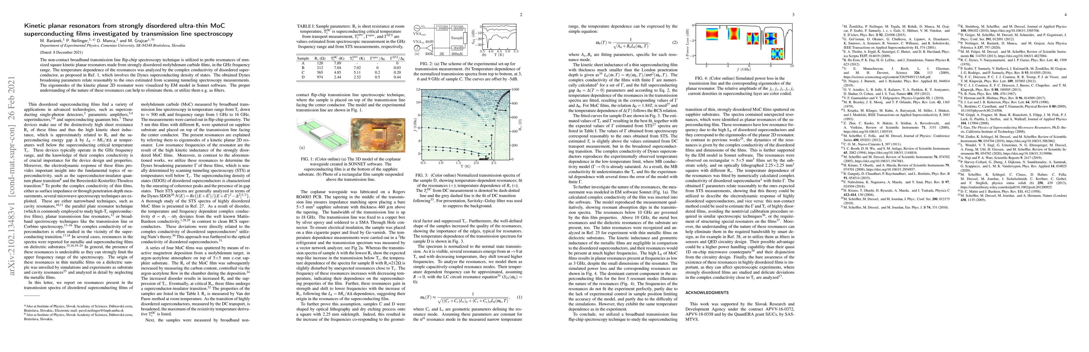 This paper investigates mm-sized kinetic planar resonators made from strongly disordered ultra-thin MoC superconducting films using broadband transmission line spectroscopy. The study analyzes the temperature dependence of GHz frequency resonances and relates obtained Dynes broadening parameters to scanning tunneling spectroscopy measurements.