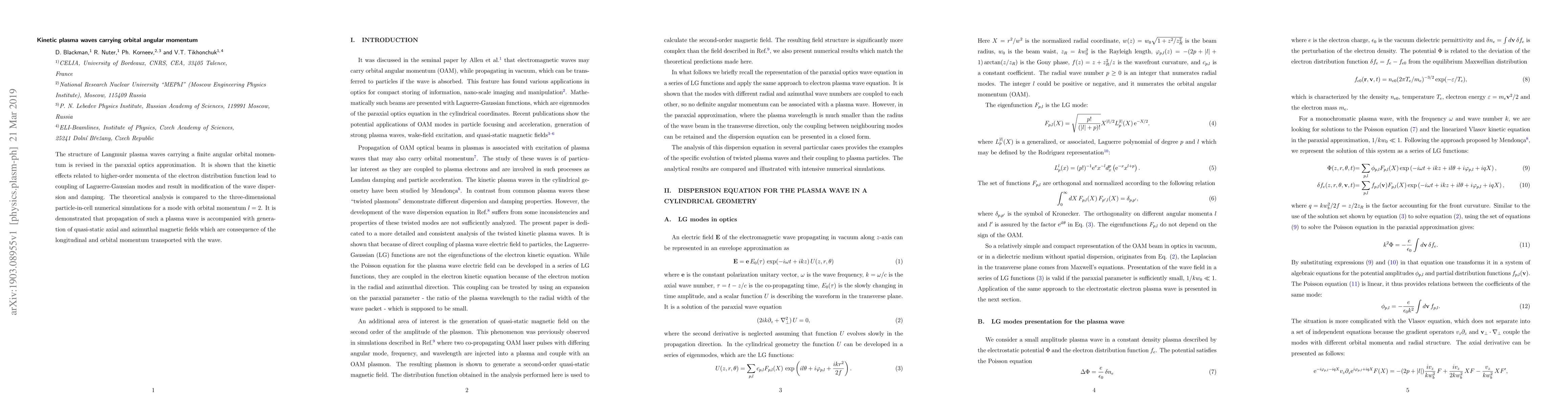 This paper investigates Langmuir plasma waves with orbital angular momentum, revealing that kinetic effects modify wave dispersion and damping through coupling of Laguerre-Gaussian modes. Numerical simulations confirm the generation of axial and azimuthal magnetic fields due to momentum transport.