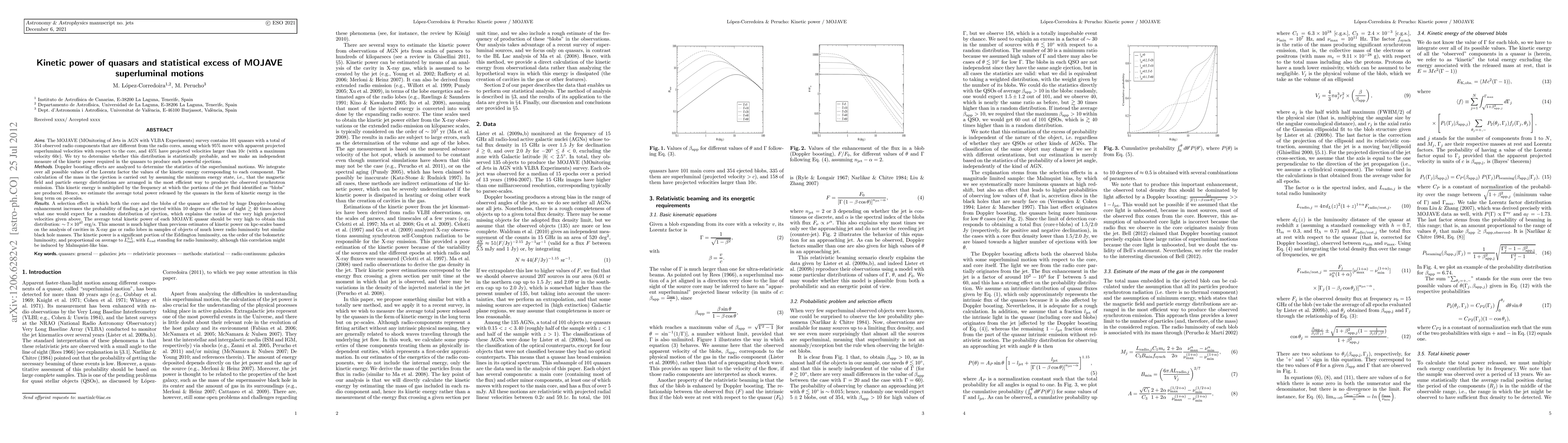 The MOJAVE survey contains 101 quasars with a total of 354 observed radio components that are different from the radio cores, among which 95% move with apparent projected superluminal velocities with respect to the core, and 45% have projected velocities larger than 10c (with a maximum velocity 60c). Doppler boosting effects are analyzed to determine the statistics of the superluminal motions. We integrate over all possible values of the Lorentz factor the values of the kinetic energy corresponding to each component. The calculation of the mass in the ejection is carried out by assuming the minimum energy state. This kinetic energy is multiplied by the frequency at which the portions of the jet fluid identified as "blobs" are produced. Hence, we estimate the average total power released by the quasars in the form of kinetic energy in the long term on pc-scales. RESULTS. A selection effect in which both the core and the blobs of the quasar are affected by huge Doppler-boosting enhancement increases the probability of finding a jet ejected within 10 degrees of the line of sight >~40 times above what one would expect for a random distribution of ejection, which explains the ratios of the very high projected velocities given above. The average total kinetic power of each MOJAVE quasar should be very high to obtain this distribution: ~7E47 erg/s. This amount is much higher than previous estimates of kinetic power on kpc-scales based on the analysis of cavities in X-ray gas or radio lobes in samples of objects of much lower radio luminosity but similar black hole masses. The kinetic power is a significant portion of the Eddington luminosity, on the order of the bolometric luminosity, and proportional on average to square root of the radio luminosity, although this correlation might be induced by Malmquist-like bias.