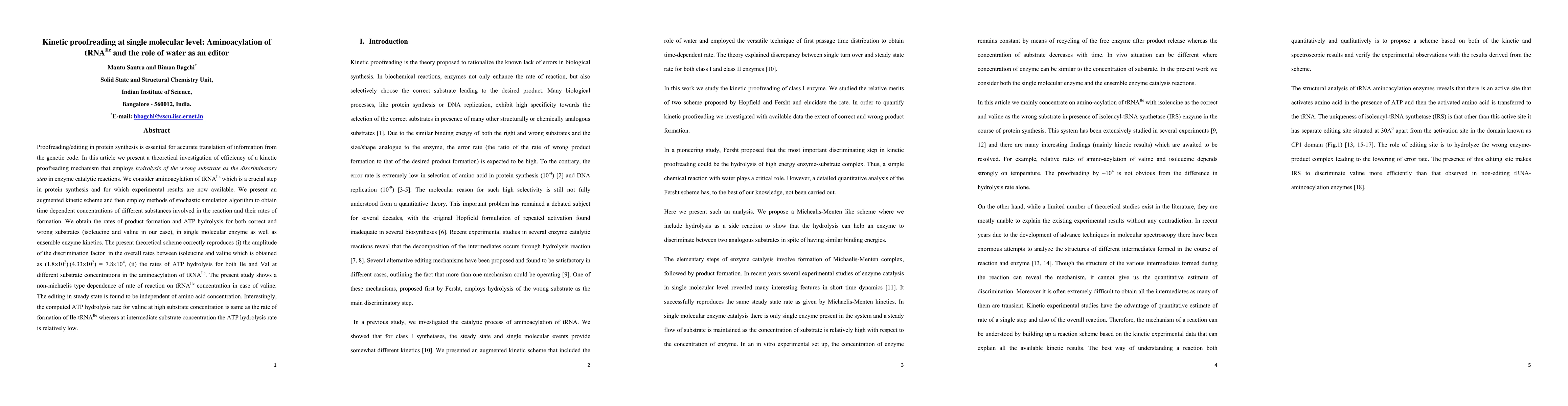 The work introduces a modified Fersht scheme to understand efficient kinetic proofreading in tRNA^Ile aminoacylation, offering a quantitative explanation for experimental observations and highlighting the role of water in editing.