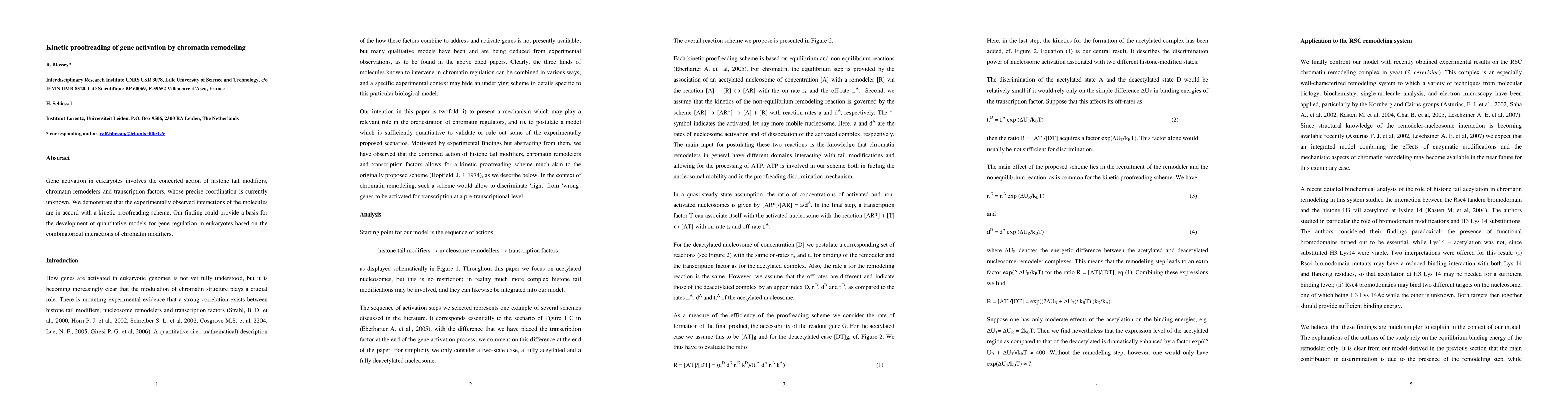 Gene activation in eukaryotes involves the concerted action of histone tail modifiers, chromatin remodellers and transcription factors, whose precise coordination is currently unknown. We demonstrate that the experimentally observed interactions of the molecules are in accord with a kinetic proofreading scheme. Our finding could provide a basis for the development of quantitative models for gene regulation in eukaryotes based on the combinatorical interactions of chromatin modifiers.