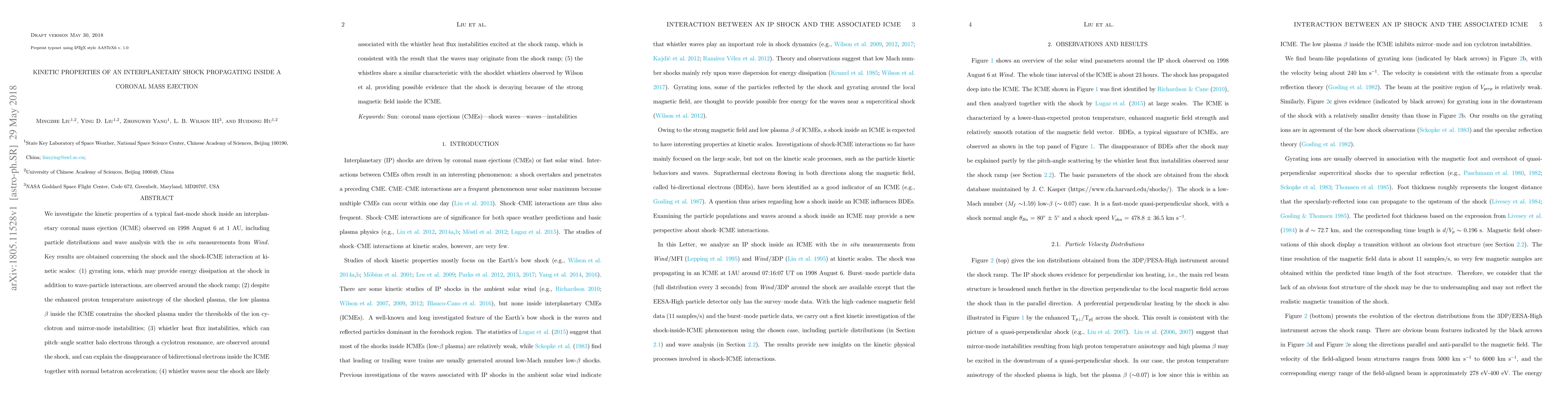 We investigate the kinetic properties of a typical fast-mode shock inside an interplanetary coronal mass ejection (ICME) observed on 1998 August 6 at 1 AU, including particle distributions and wave analysis with the in situ measurements from Wind. Key results are obtained concerning the shock and the shock-ICME interaction at kinetic scales: (1) gyrating ions, which may provide energy dissipation at the shock in addition to wave-particle interactions, are observed around the shock ramp; (2) despite the enhanced proton temperature anisotropy of the shocked plasma, the low plasma beta inside the ICME constrains the shocked plasma under the thresholds of the ion cyclotron and mirror-mode instabilities; (3) whistler heat flux instabilities, which can pitch--angle scatter halo electrons through a cyclotron resonance, are observed around the shock, and can explain the disappearance of bidirectional electrons inside the ICME together with normal betatron acceleration; (4) whistler waves near the shock are likely associated with the whistler heat flux instabilities excited at the shock ramp, which is consistent with the result that the waves may originate from the shock ramp; (5) the whistlers share a similar characteristic with the shocklet whistlers observed by Wilson et al, providing possible evidence that the shock is decaying because of the strong magnetic field inside the ICME.