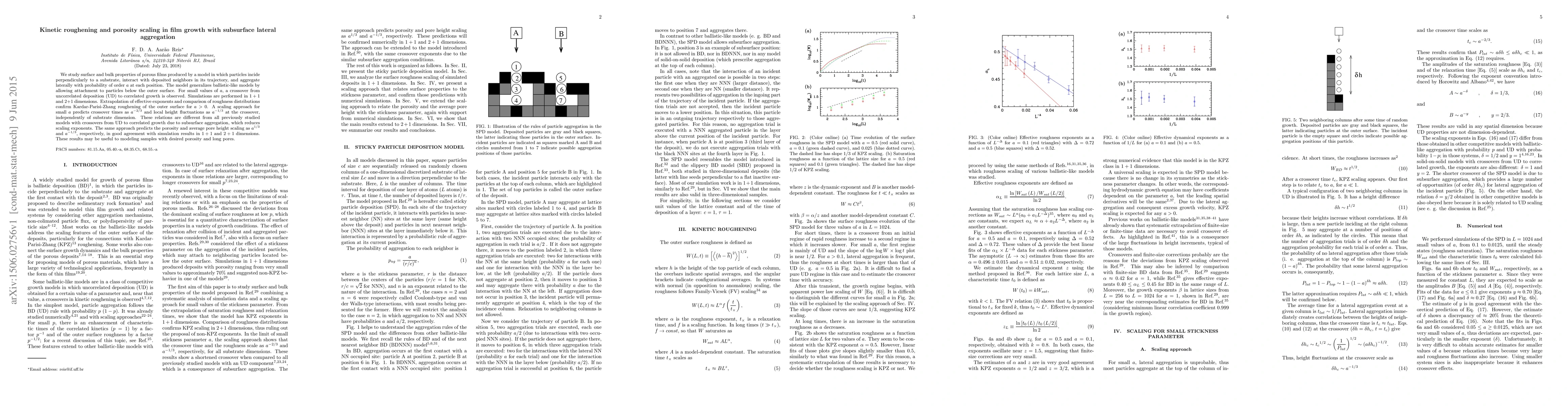 We study surface and bulk properties of porous films produced by a model in which particles incide perpendicularly to a substrate, interact with deposited neighbors in its trajectory, and aggregate laterally with probability of order $a$ at each position. The model generalizes ballistic-like models by allowing attachment to particles below the outer surface. For small values of $a$, a crossover from uncorrelated deposition (UD) to correlated growth is observed. Simulations are performed in 1+1 and 2+1 dimensions. Extrapolation of effective exponents and comparison of roughness distributions confirm Kardar-Parisi-Zhang roughening of the outer surface for $a>0$. A scaling approach for small $a$ predicts crossover times as $a^{-2/3}$ and local height fluctuations as $a^{-1/3}$ at the crossover, independently of substrate dimension. These relations are different from all previously studied models with crossovers from UD to correlated growth due to subsurface aggregation, which reduces scaling exponents. The same approach predicts the porosity and average pore height scaling as $a^{1/3}$ and $a^{-1/3}$, respectively, in good agreement with simulation results in 1+1 and 2+1 dimensions. These results may be useful to modeling samples with desired porosity and long pores.