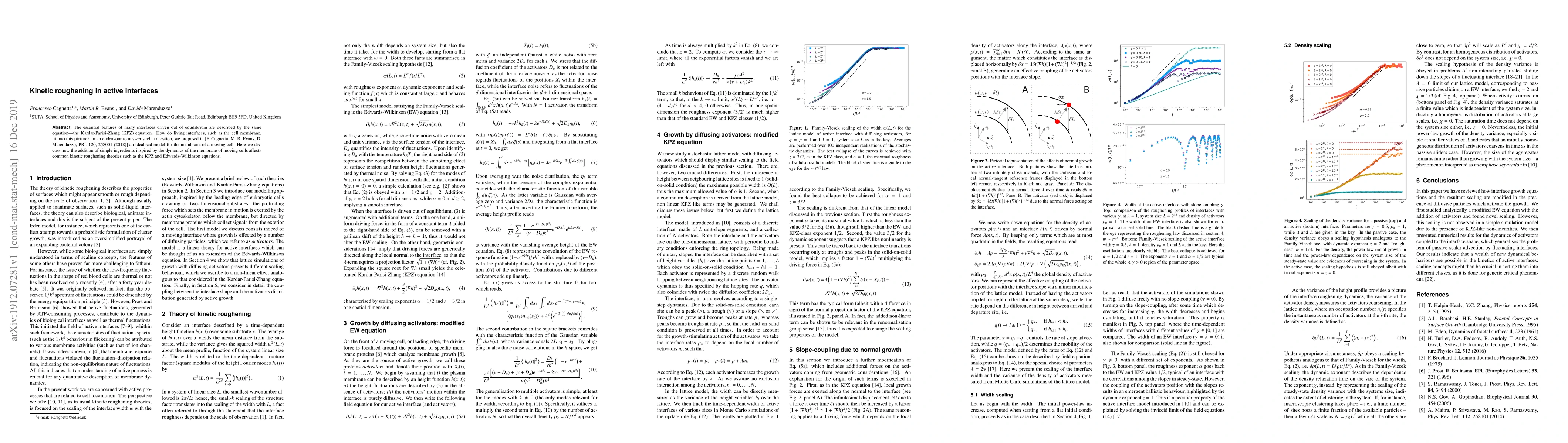 This paper investigates how kinetic roughening in active interfaces, like cell membranes, deviates from traditional models such as the Kardar-Parisi-Zhang (KPZ) equation by incorporating dynamics inspired by moving cells, challenging established kinetic roughening theories.