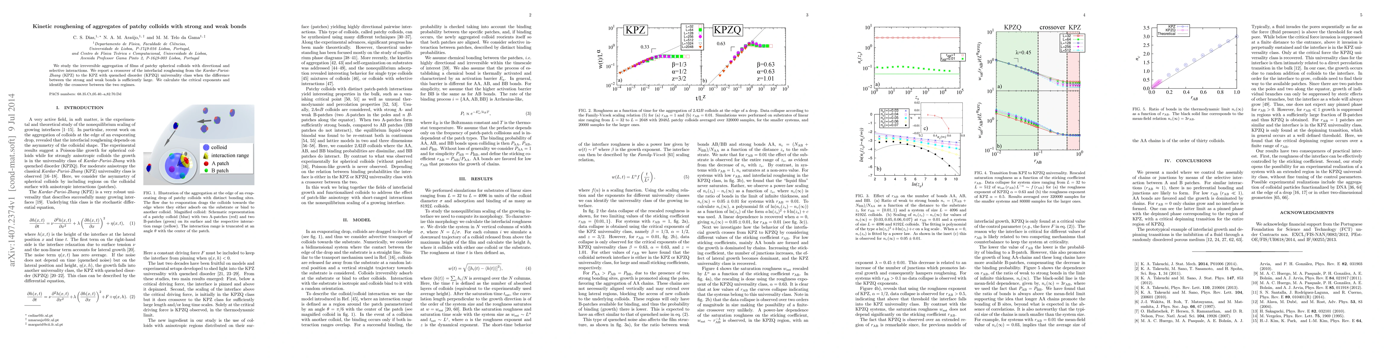 We study the irreversible aggregation of films of patchy spherical colloids with directional and selective interactions. We report a crossover of the interfacial roughening from the Kardar-Parisi-Zhang (KPZ) to the KPZ with quenched disorder (KPZQ) universality class when the difference between the strong and weak bonds is sufficiently large. We calculate the critical exponents and identify the crossover between the two regimes.