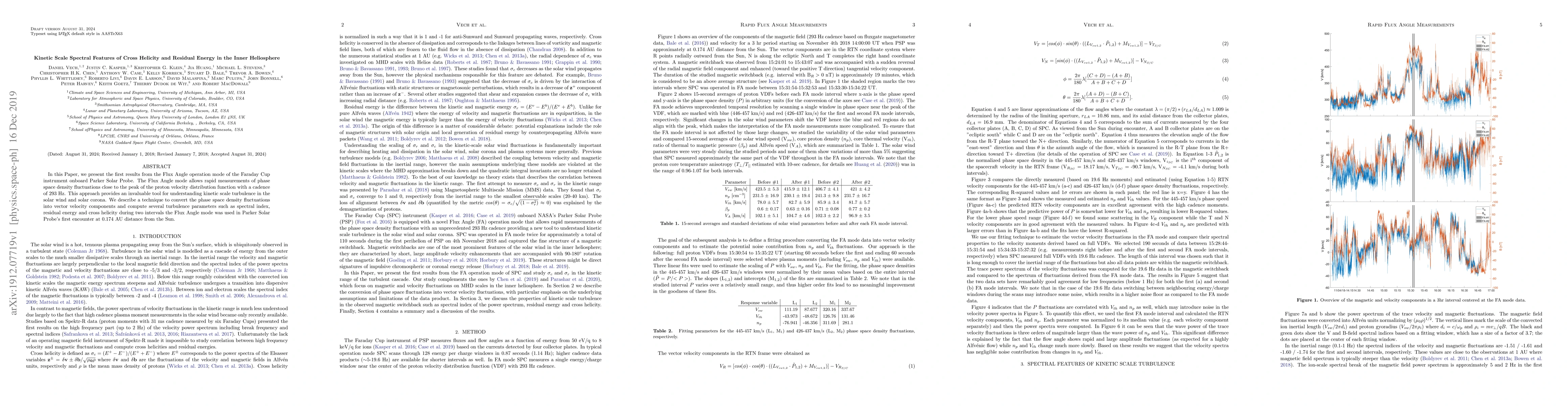 This paper reports on the first kinetic scale turbulence measurements in the inner heliosphere using the Flux Angle mode of Parker Solar Probe's Faraday Cup instrument, revealing spectral features of cross helicity and residual energy. The technique converts phase space density fluctuations into velocity components, providing insights into solar wind and corona turbulence.