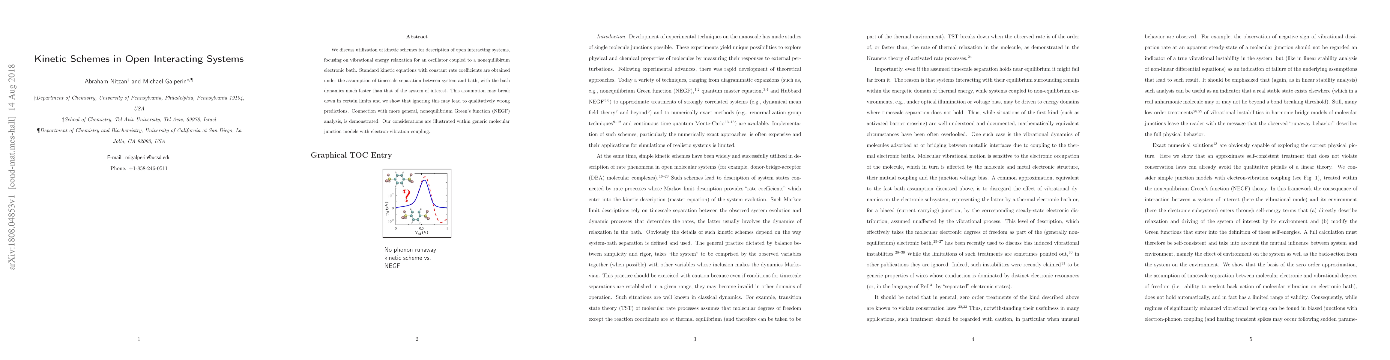 We discuss utilization of kinetic schemes for description of open interacting systems, focusing on vibrational energy relaxation for an oscillator coupled to a nonequilibirum electronic bath. Standard kinetic equations with constant rate coefficients are obtained under the assumption of timescale separation between system and bath, with the bath dynamics much faster than that of the system of interest. This assumption may break down in certain limits and we show that ignoring this may lead to qualitatively wrong predictions. Connection with more general, nonequilibrium Green's function (NEGF) analysis, is demonstrated. Our considerations are illustrated within generic molecular junction models with electron-vibration coupling.
