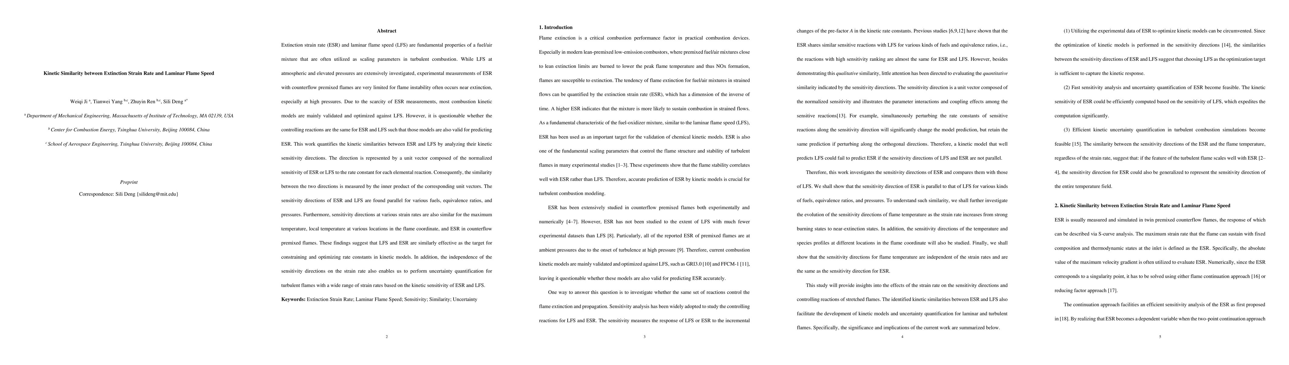 This research quantifies the kinetic similarities between extinction strain rate (ESR) and laminar flame speed (LFS) in counterflow premixed flames, finding their sensitivity directions parallel for various fuels, equivalence ratios, and pressures. This suggests that LFS can effectively predict ESR, enabling broader uncertainty quantification for turbulent flames with varying strain rates.
