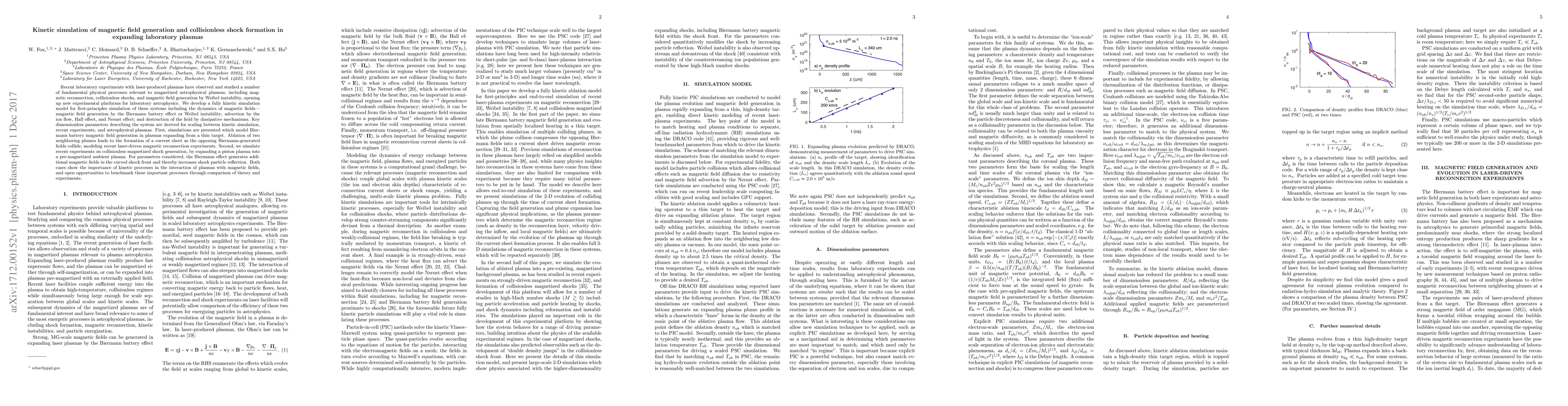This paper develops a kinetic simulation model to study magnetic field generation and collisionless shock formation in expanding laboratory plasmas, focusing on the Biermann battery effect and Weibel instability. The simulations model magnetic reconnection and magnetized shock generation, highlighting the importance of kinetic processes in plasma-magnetic field interactions.