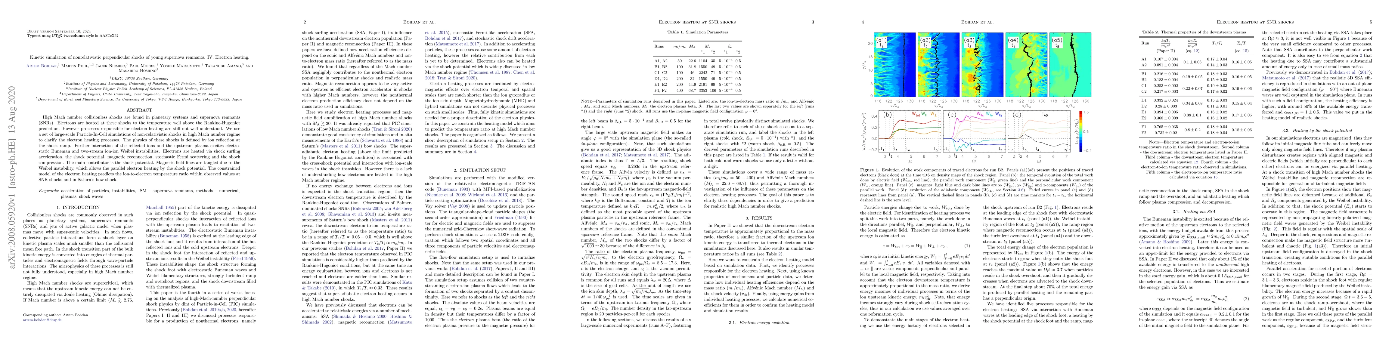 This paper uses large-scale Particle-In-Cell simulations to investigate electron heating mechanisms in high Mach number nonrelativistic shocks in young supernova remnants, identifying shock potential as the main contributor. The study also highlights the role of ion reflection, magnetic reconnection, and Weibel instabilities in the heating process.
