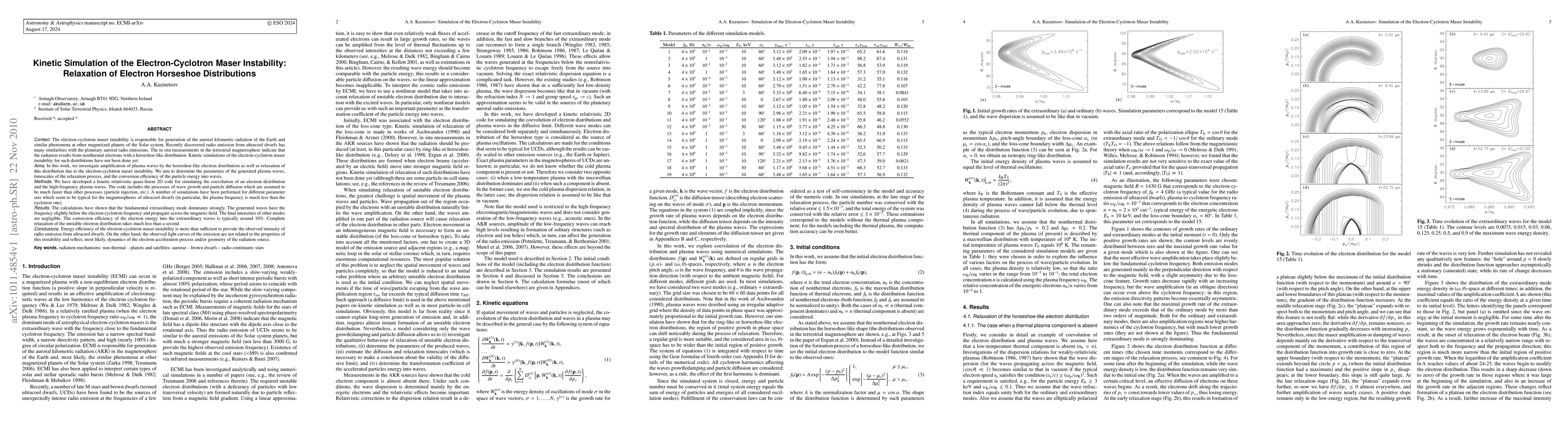 This paper investigates the electron-cyclotron maser instability (ECMI) responsible for auroral radio emissions and ultracool dwarf radio bursts, focusing on amplification by horseshoe-like electron distributions. Simulations show that the fundamental extraordinary mode dominates, with a conversion efficiency of around 10%, and complete relaxation of the electron distribution occurs in less than a second.