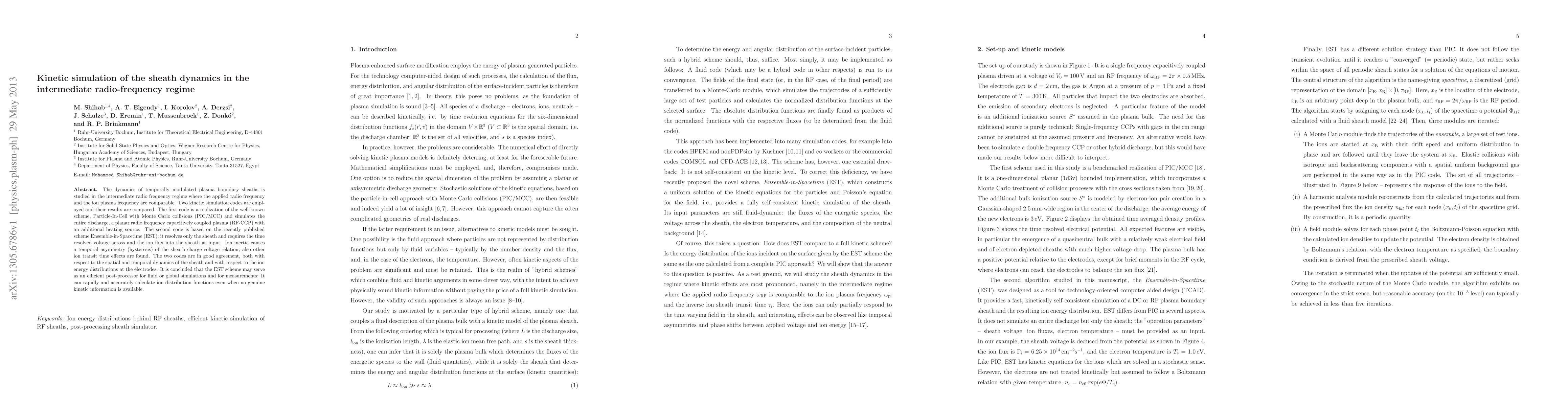 The dynamics of temporally modulated plasma boundary sheaths is studied in the intermediate radio frequency regime where the applied radio frequency and the ion plasma frequency are comparable. Two kinetic simulation codes are employed and their results are compared. The first code is a realization of the well-known scheme, Particle-In-Cell with Monte Carlo collisions (PIC/MCC) and simulates the entire discharge, a planar radio frequency capacitively coupled plasma (RF-CCP) with an additional heating source. The second code is based on the recently published scheme Ensemble-in-Spacetime (EST); it resolves only the sheath and requires the time resolved voltage across and the ion flux into the sheath as input. Ion inertia causes a temporal asymmetry (hysteresis) of the sheath charge-voltage relation; also other ion transit time effects are found. The two codes are in good agreement, both with respect to the spatial and temporal dynamics of the sheath and with respect to the ion energy distributions at the electrodes. It is concluded that the EST scheme may serve as an efficient post-processor for fluid or global simulations and for measurements: It can rapidly and accurately calculate ion distribution functions even when no genuine kinetic information is available.
