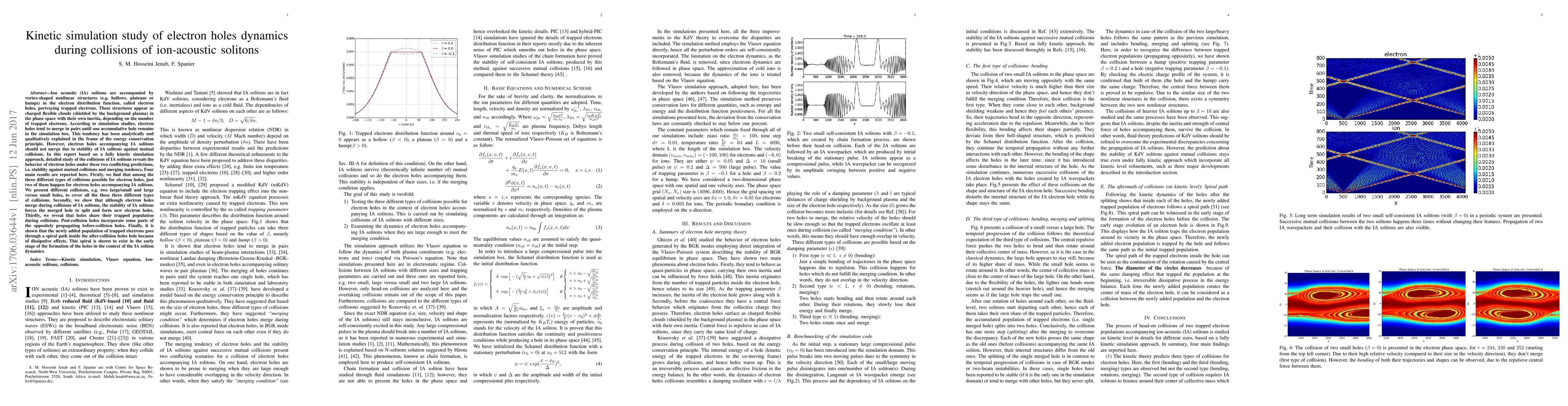 This paper uses kinetic simulation to study the dynamics of electron holes during collisions of ion-acoustic solitons, revealing that while electron holes merge, the stability of solitons causes them to split into new holes. The study also shows that trapped electron populations are shared between colliding holes and that newly trapped electrons follow spiral paths due to dissipative effects.