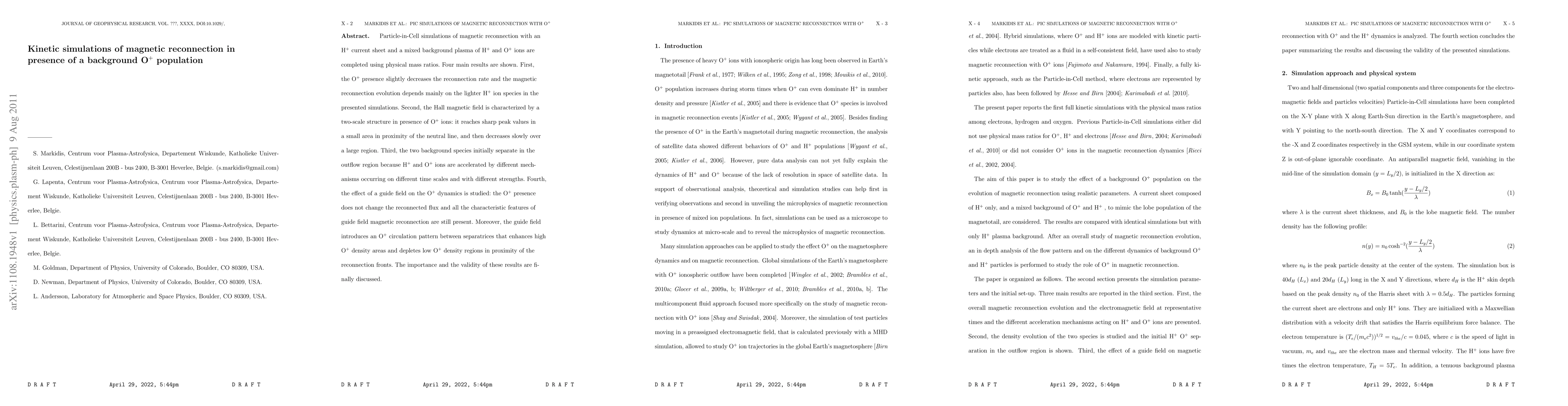 The research uses Particle-in-Cell simulations to study magnetic reconnection with H+ and O+ ions, finding that O+ presence slightly reduces reconnection rate, with H+ dominating evolution. Results highlight a two-scale Hall magnetic field structure, species separation in outflow region due to distinct acceleration mechanisms, and guide field effects causing O+ circulation patterns. Importance and validity of findings are discussed.