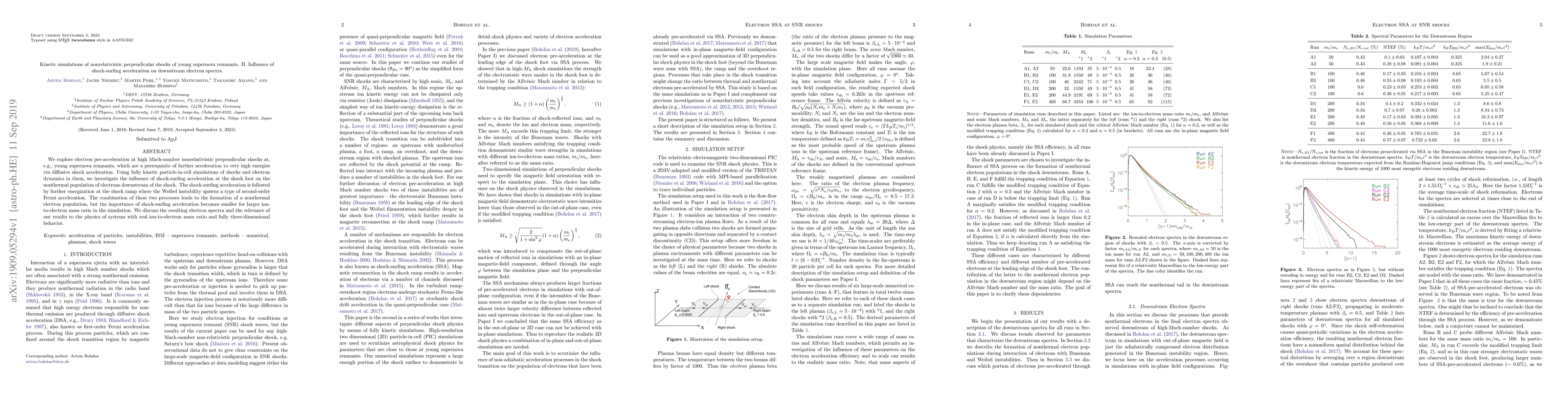 This paper uses kinetic simulations to study electron acceleration at nonrelativistic perpendicular shocks in young supernova remnants, focusing on shock-surfing acceleration's impact on downstream electron spectra. The results show that shock-surfing and subsequent Weibel-driven Fermi acceleration jointly create nonthermal electron populations, though the effect diminishes with higher ion-to-electron mass ratios.