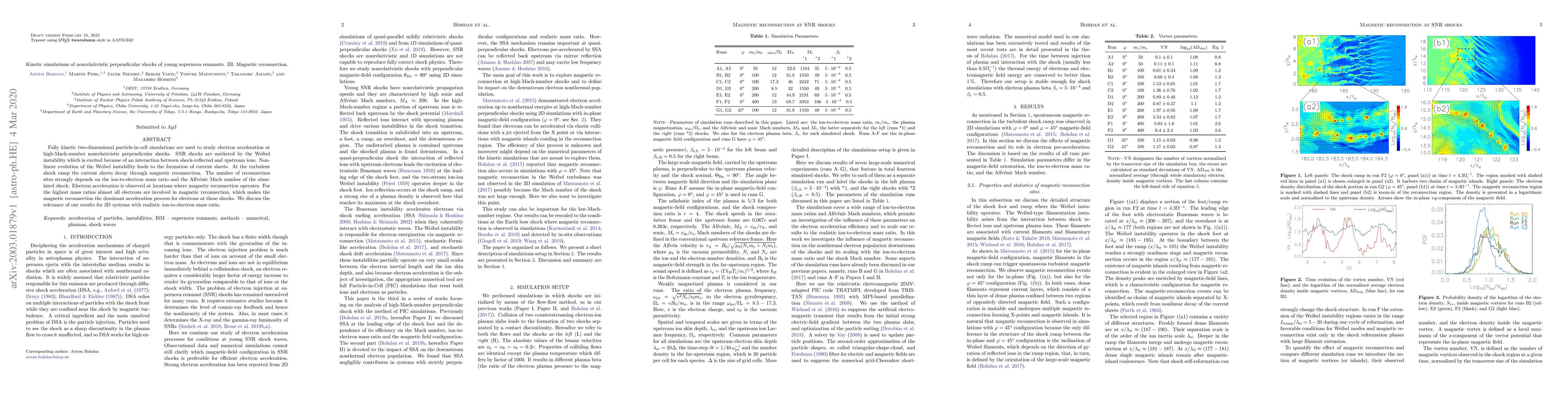 This paper uses kinetic simulations to study electron acceleration in nonrelativistic perpendicular shocks of young supernova remnants, focusing on magnetic reconnection driven by the Weibel instability. The simulations show that magnetic reconnection is the dominant electron acceleration mechanism for high ion-to-electron mass ratios.