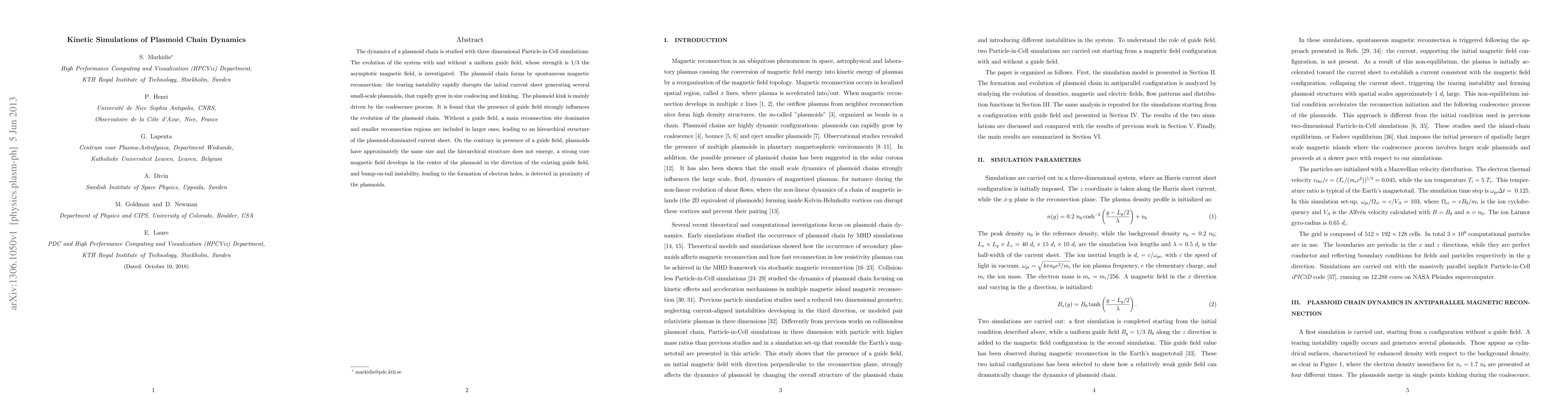 The dynamics of a plasmoid chain is studied with three dimensional Particle-in-Cell simulations. The evolution of the system with and without a uniform guide field, whose strength is 1/3 the asymptotic magnetic field, is investigated. The plasmoid chain forms by spontaneous magnetic reconnection: the tearing instability rapidly disrupts the initial current sheet generating several small-scale plasmoids, that rapidly grow in size coalescing and kinking. The plasmoid kink is mainly driven by the coalescence process. It is found that the presence of guide field strongly influences the evolution of the plasmoid chain. Without a guide field, a main reconnection site dominates and smaller reconnection regions are included in larger ones, leading to an hierarchical structure of the plasmoid-dominated current sheet. On the contrary in presence of a guide field, plasmoids have approximately the same size and the hierarchical structure does not emerge, a strong core magnetic field develops in the center of the plasmoid in the direction of the existing guide field, and bump-on-tail instability, leading to the formation of electron holes, is detected in proximity of the plasmoids.