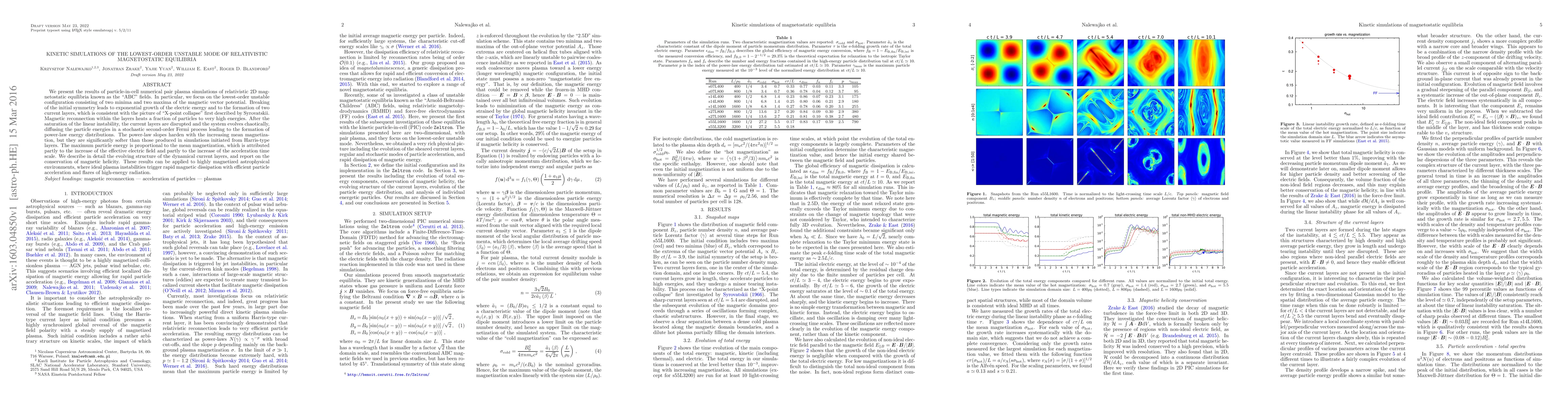 We present the results of particle-in-cell numerical pair plasma simulations of relativistic 2D magnetostatic equilibria known as the 'ABC' fields. In particular, we focus on the lowest-order unstable configuration consisting of two minima and two maxima of the magnetic vector potential. Breaking of the initial symmetry leads to exponential growth of the electric energy and to the formation of two current layers, which is consistent with the picture of 'X-point collapse' first described by Syrovatskii. Magnetic reconnection within the layers heats a fraction of particles to very high energies. After the saturation of the linear instability, the current layers are disrupted and the system evolves chaotically, diffusing the particle energies in a stochastic second-order Fermi process leading to the formation of power-law energy distributions. The power-law slopes harden with the increasing mean magnetization, but they are significantly softer than those produced in simulations initiated from Harris-type layers. The maximum particle energy is proportional to the mean magnetization, which is attributed partly to the increase of the effective electric field and partly to the increase of the acceleration time scale. We describe in detail the evolving structure of the dynamical current layers, and report on the conservation of magnetic helicity. These results can be applied to highly magnetized astrophysical environments, where ideal plasma instabilities trigger rapid magnetic dissipation with efficient particle acceleration and flares of high-energy radiation.