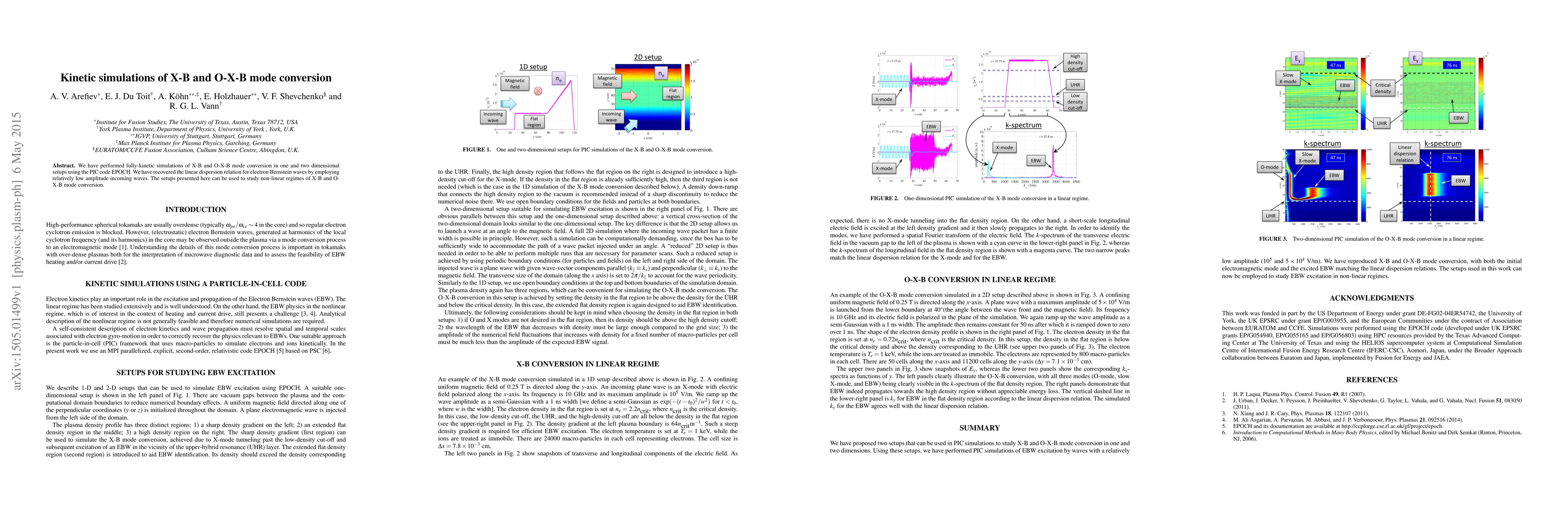 We have performed fully-kinetic simulations of X-B and O-X-B mode conversion in one and two dimensional setups using the PIC code EPOCH. We have recovered the linear dispersion relation for electron Bernstein waves by employing relatively low amplitude incoming waves. The setups presented here can be used to study non-linear regimes of X-B and O-X-B mode conversion.