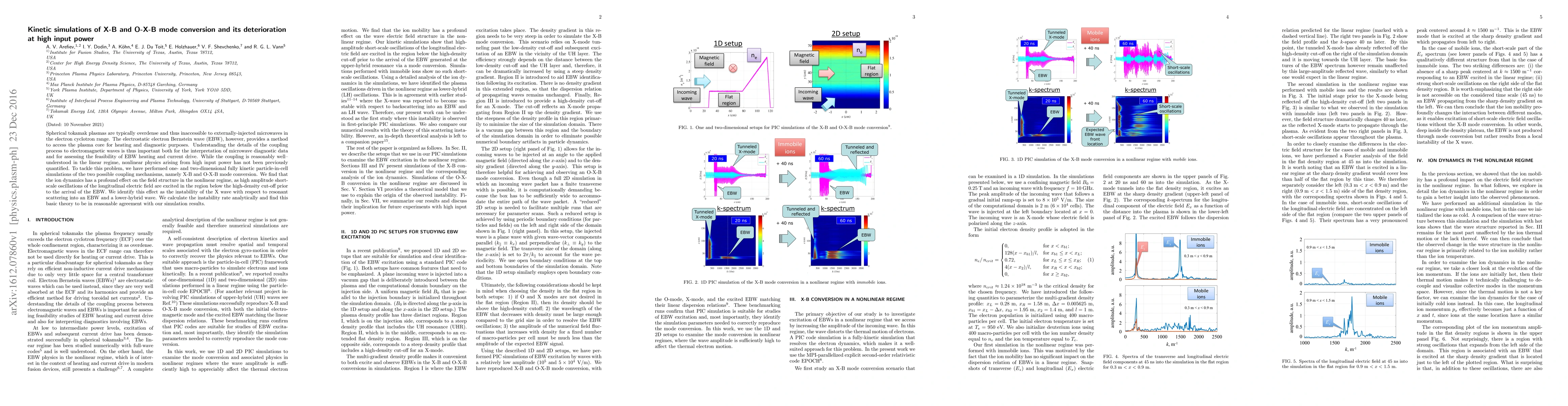 This paper investigates kinetic simulations of X-B and O-X-B mode conversion in spherical tokamak plasmas, revealing that high input power leads to nonlinear dynamics and instability, affecting the coupling process for electron Bernstein wave heating and diagnostics. The study identifies resonant scattering as a key factor in the deterioration of mode conversion efficiency at high power levels.