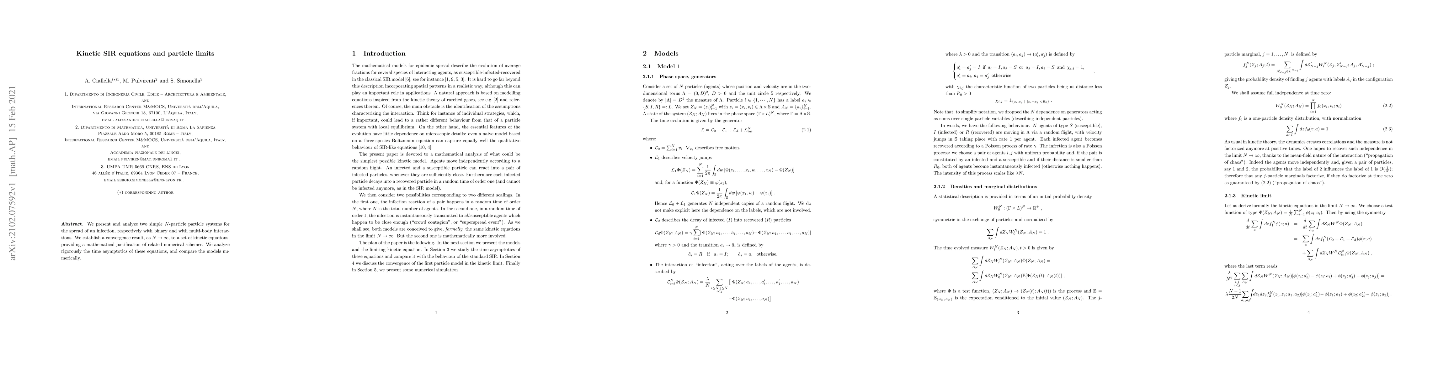 We present and analyze two simple $N$-particle particle systems for the spread of an infection, respectively with binary and with multi-body interactions. We establish a convergence result, as $N \to \infty$, to a set of kinetic equations, providing a mathematical justification of related numerical schemes. We analyze rigorously the time asymptotics of these equations, and compare the models numerically.