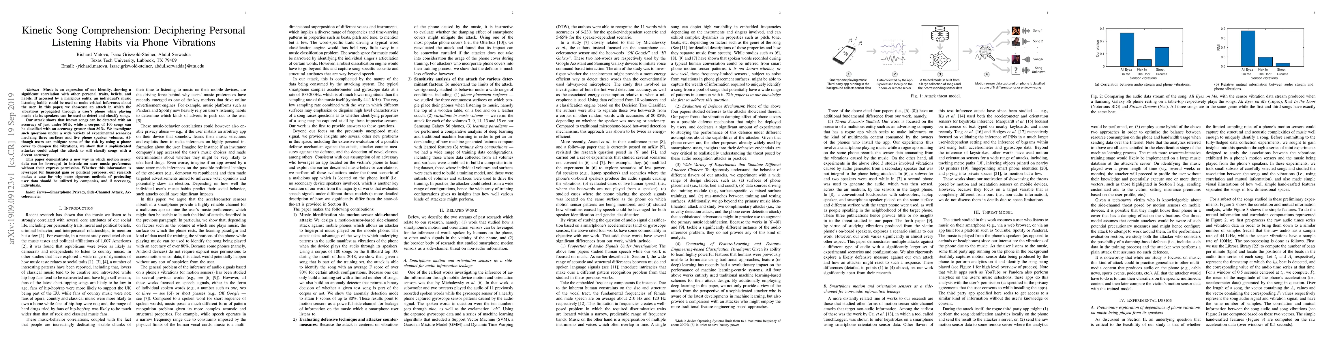 This paper explores an attack method that uses phone vibrations to detect and classify songs being played, revealing a potential privacy risk tied to personal music listening habits. Despite mitigation efforts, the attack maintains high accuracy, underscoring the need for stronger data protection measures.