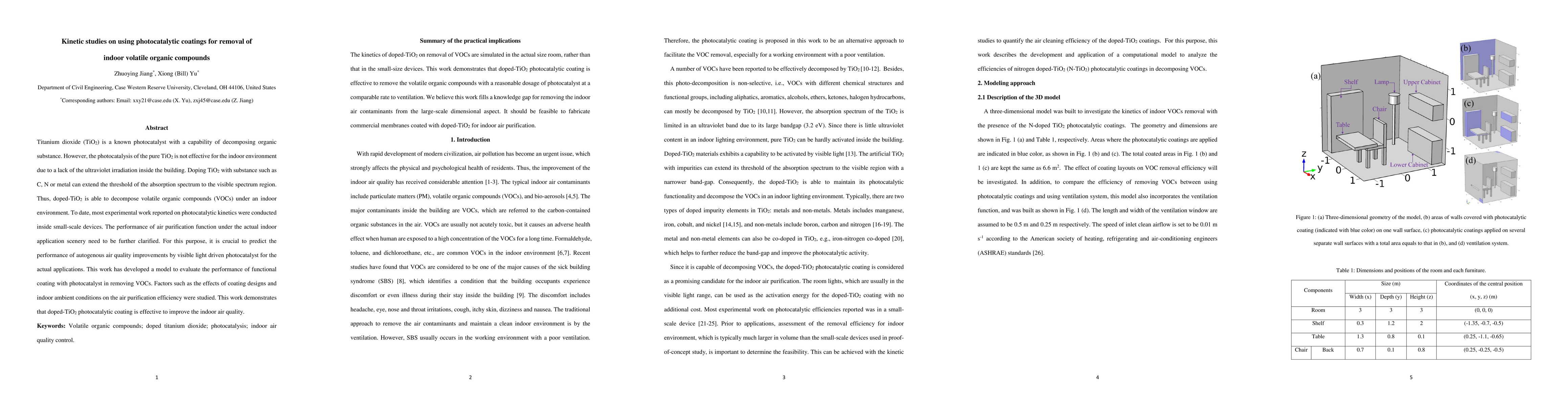 This study investigates the kinetic performance of doped TiO2 photocatalytic coatings for removing indoor volatile organic compounds (VOCs) under visible light. The research develops a model to predict the effectiveness of these coatings in actual indoor environments, demonstrating their potential to significantly improve indoor air quality.