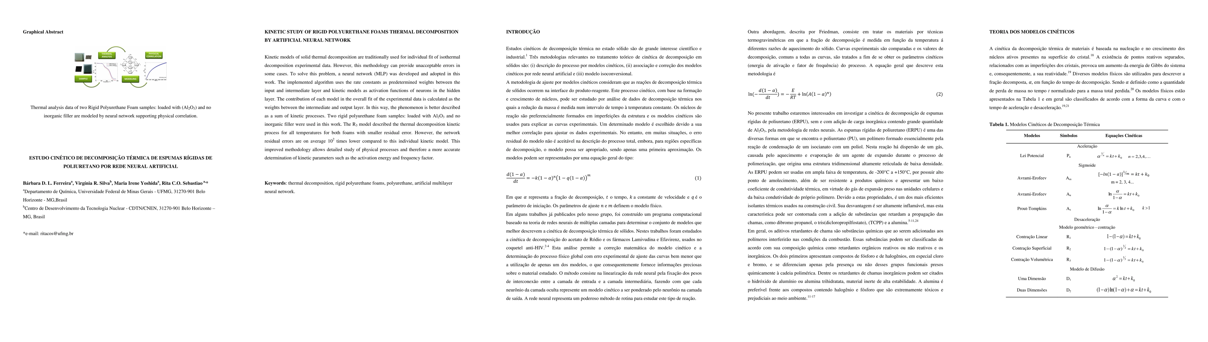 Kinetic models of solid thermal decomposition are traditionally used for individual fit of isothermal decomposition experimental data. However, this methodology can provide unacceptable errors in some cases. To solve this problem, a neural network (MLP) was developed and adopted in this work. The implemented algorithm uses the rate constants as predetermined weights between the input and intermediate layer and kinetic models as activation functions of neurons in the hidden layer. The contribution of each model in the overall fit of the experimental data is calculated as the weights between the intermediate and output layer. In this way, the phenomenon is better described as a sum of kinetic processes. Two rigid polyurethane foam samples: loaded with Al2O3 and no inorganic filler were used in this work. The R3 model described the thermal decomposition kinetic process for all temperatures for both foams with smaller residual error. However, the network residual errors are on average 102 times lower compared to this individual kinetic model. This improved methodology allows detailed study of physical processes and therefore a more accurate determination of kinetic parameters such as the activation energy and frequency factor.