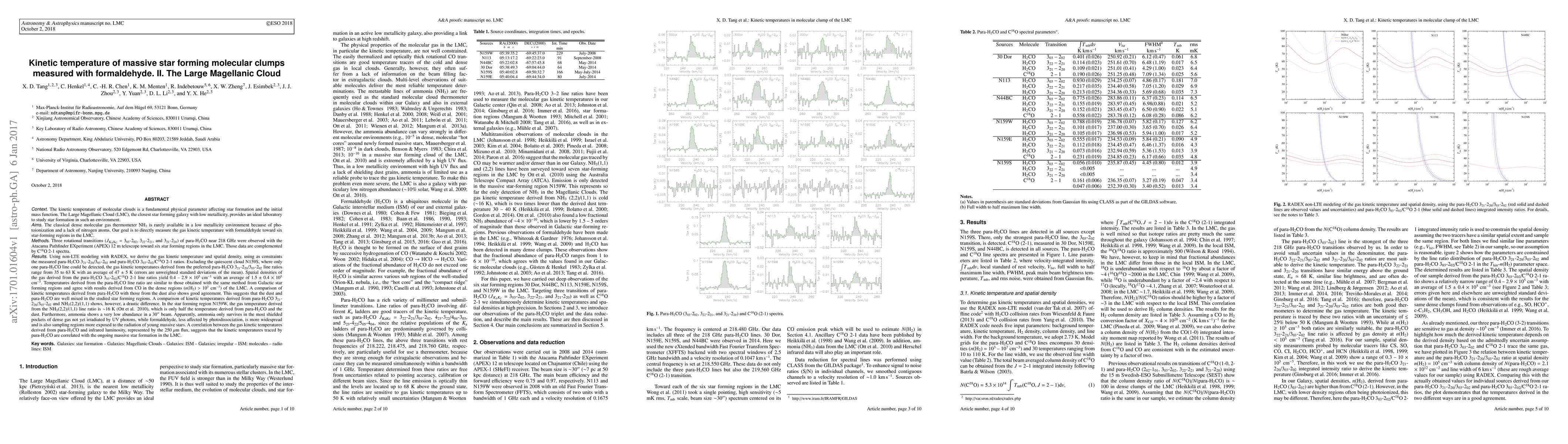 This study measures the kinetic temperature of star-forming molecular clumps in the Large Magellanic Cloud using formaldehyde (para-H2CO) lines observed with the APEX telescope. The derived temperatures range from 35 to 63 K, indicating a correlation with ongoing massive star formation, as suggested by the infrared luminosity.