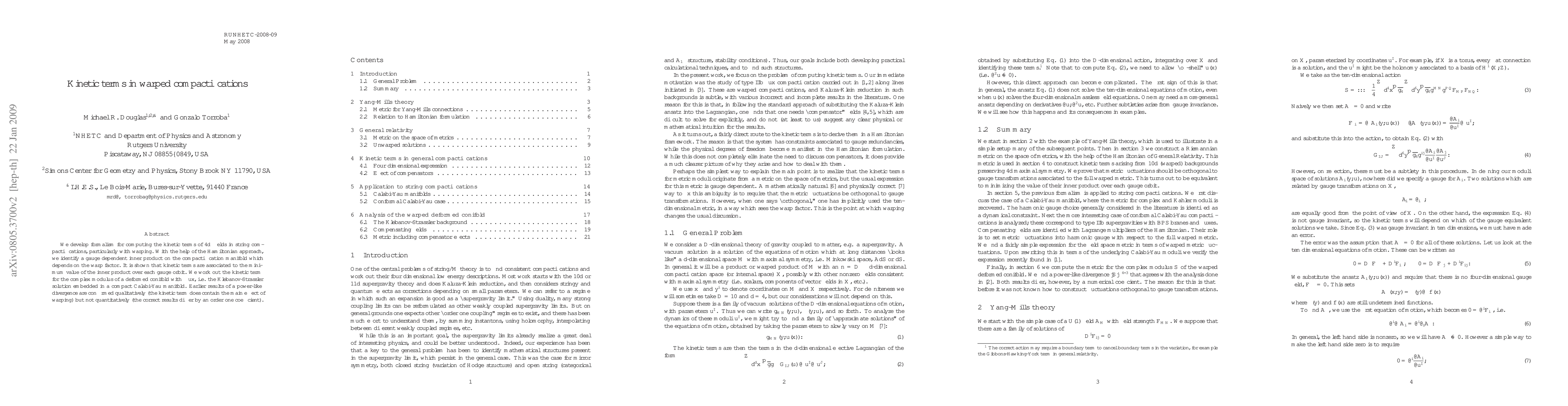 We develop formalism for computing the kinetic terms of 4d fields in string compactifications, particularly with warping. With the help of the Hamiltonian approach, we identify a gauge dependent inner product on the compactification manifold which depends on the warp factor. It is shown that kinetic terms are associated to the minimum value of the inner product over each gauge orbit. We work out the kinetic term for the complex modulus of a deformed conifold with flux, i.e. the Klebanov-Strassler solution embedded in a compact Calabi-Yau manifold. Earlier results of a power-like divergence are confirmed qualitatively (the kinetic term does contain the main effect of warping) but not quantitatively (the correct results differ by an order one coefficient).