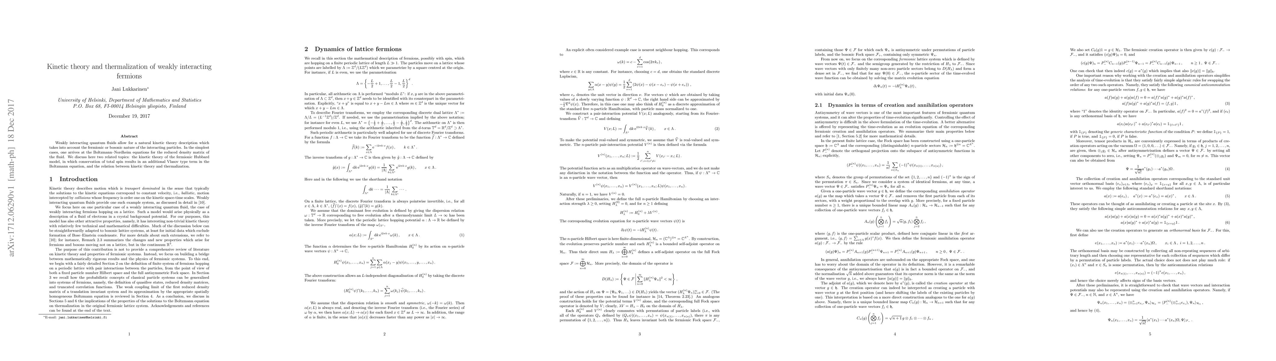 This paper explores the kinetic theory of weakly interacting fermions, focusing on the Boltzmann-Nordheim equations for the Hubbard model, which includes a Vlasov term due to spin conservation. It also investigates the connection between kinetic theory and the process of thermalization in these systems.