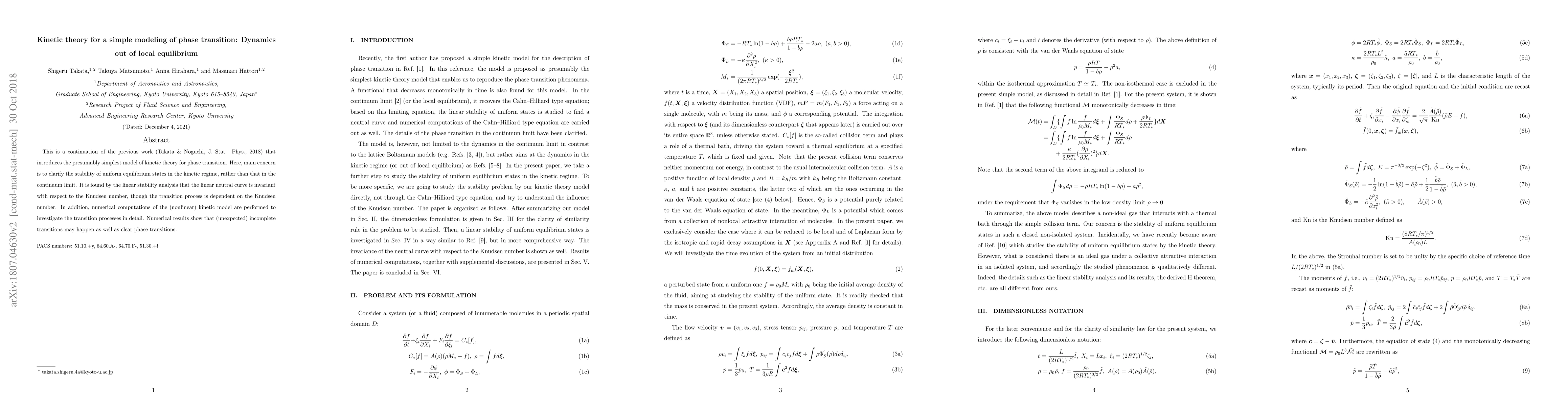 A study investigates phase transitions in a simplified kinetic theory model, finding that linear neutral curves are invariant to the Knudsen number but transition processes depend on it, leading to unexpected incomplete transitions.
