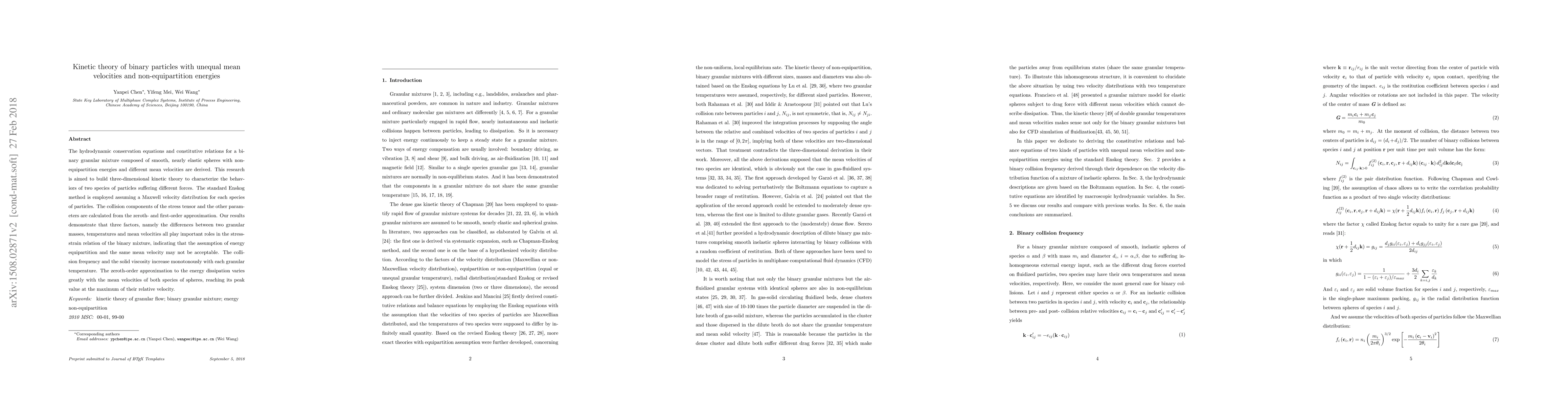 The paper presents a detailed three-dimensional kinetic theory model for binary granular mixtures with unequal mean velocities and non-equipartition energies, deriving hydrodynamic conservation equations and constitutive relations.