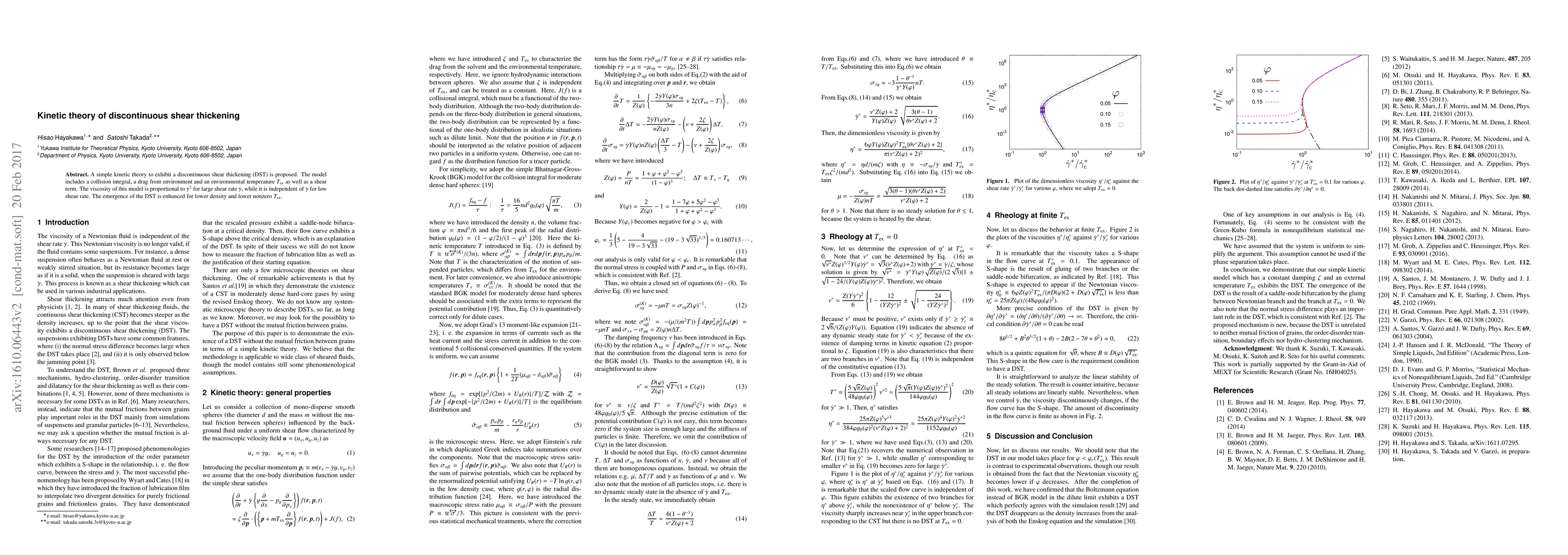 This paper proposes a kinetic theory model to explain discontinuous shear thickening, showing that viscosity increases quadratically with shear rate for high shear rates, while remaining Newtonian at low rates. The model highlights that DST is more pronounced at lower densities and lower external temperatures.