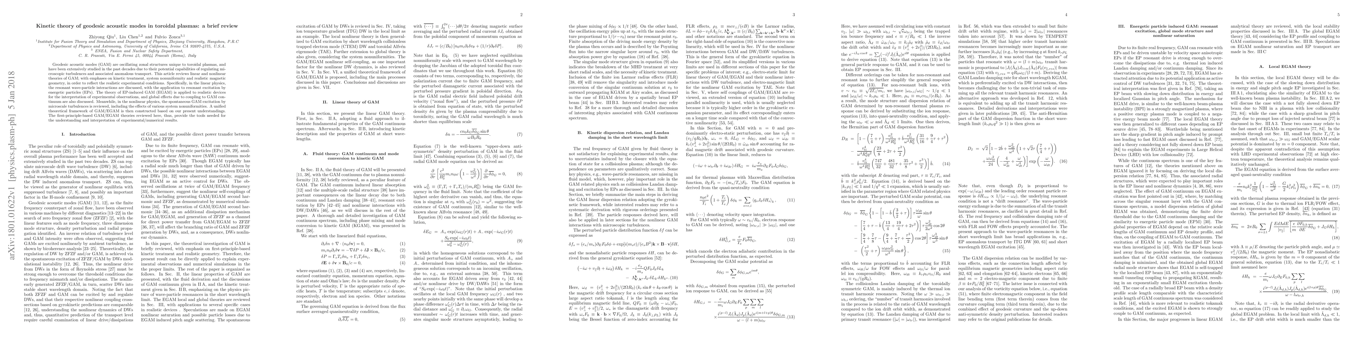 Geodesic acoustic modes (GAM) are oscillating zonal structures unique to toroidal plasmas, and have been extensively studied in the past decades due to their potential capabilities of regulating microscopic turbulences and associated anomalous transport. This article reviews linear and nonlinear theories of GAM; with emphases on kinetic treatment, system nonuniformity and realistic magnetic geometry, in order to reflect the realistic experimental conditions. Specifically, in the linear physics, the resonant wave-particle interactions are discussed, with the application to resonant excitation by energetic particles (EPs). The theory of EP-induced GAM (EGAM) is applied to realistic devices for the interpretation of experimental observations, and global effects due to coupling to GAM continuum are also discussed. Meanwhile, in the nonlinear physics, the spontaneous GAM excitation by microscale turbulences is reviewed, including the effects of various system nonuniformities. A unified theoretical framework of GAM/EGAM is then constructed based on our present understandings. The first-principle-based GAM/EGAM theories reviewed here, thus, provide the tools needed for the understanding and interpretation of experimental/numerical results.