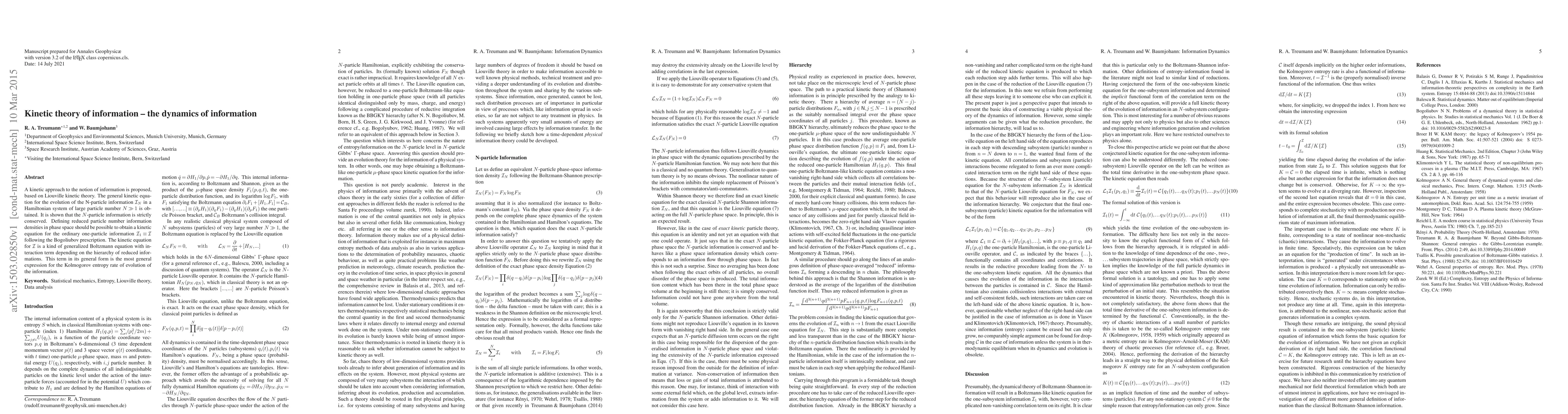 This paper proposes a kinetic theory framework for information dynamics based on Liouville kinetic theory, deriving a general kinetic equation for the evolution of N-particle information in large Hamiltonian systems. The study shows that N-particle information is conserved and suggests a method to obtain a generalized Boltzmann equation for one-particle information, incorporating a Kolmogorov entropy rate term.