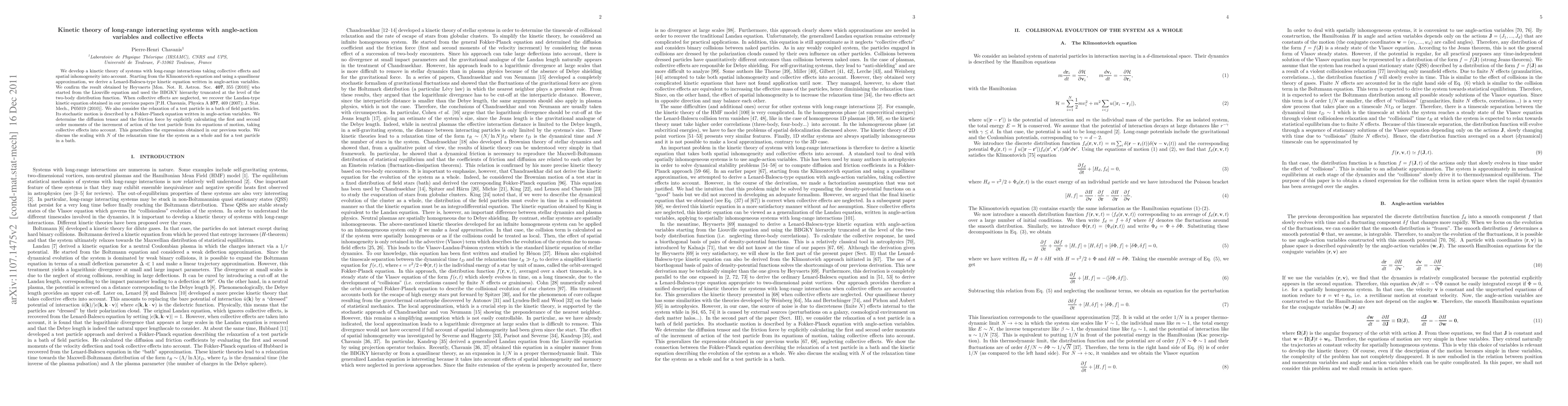 We develop a kinetic theory of systems with long-range interactions taking collective effects and spatial inhomogeneity into account. Starting from the Klimontovich equation and using a quasilinear approximation, we derive a Lenard-Balescu-type kinetic equation written in angle-action variables. We confirm the result obtained by Heyvaerts [Mon. Not. R. Astron. Soc. {\bf 407}, 355 (2010)] who started from the Liouville equation and used the BBGKY hierarchy truncated at the level of the two-body distribution function. When collective effects are neglected, we recover the Landau-type kinetic equation obtained in our previous papers [P.H. Chavanis, Physica A {\bf 377}, 469 (2007); J. Stat. Mech., P05019 (2010)]. We also consider the relaxation of a test particle in a bath of field particles. Its stochastic motion is described by a Fokker-Planck equation written in angle-action variables. We determine the diffusion tensor and the friction force by explicitly calculating the first and second order moments of the increment of action of the test particle from its equations of motion, taking collective effects into account. This generalizes the expressions obtained in our previous works. We discuss the scaling with $N$ of the relaxation time for the system as a whole and for a test particle in a bath.