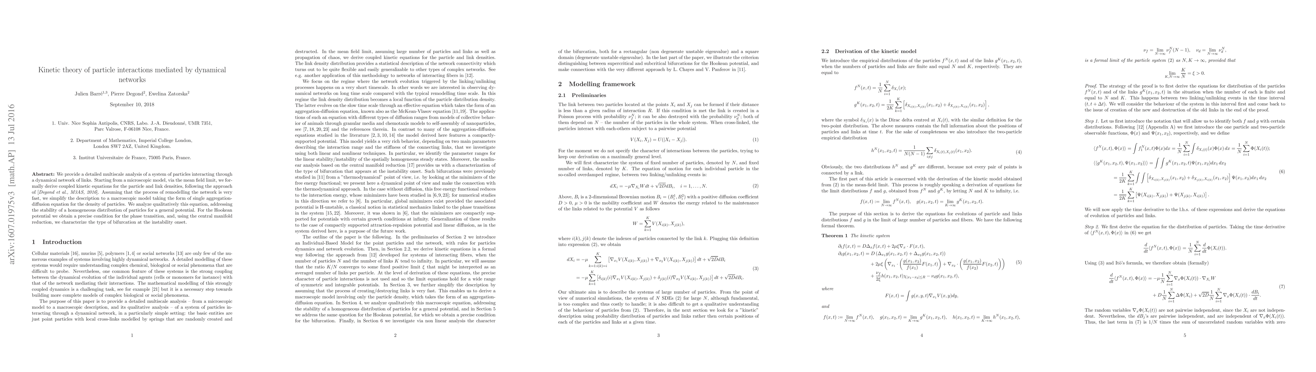 We provide a detailed multiscale analysis of a system of particles interacting through a dynamical network of links. Starting from a microscopic model, via the mean field limit, we formally derive coupled kinetic equations for the particle and link densities, following the approach of [Degond et al., M3AS, 2016]. Assuming that the process of remodelling the network is very fast, we simplify the description to a macroscopic model taking the form of single aggregation-diffusion equation for the density of particles. We analyze qualitatively this equation, addressing the stability of a homogeneous distribution of particles for a general potential. For the Hookean potential we obtain a precise condition for the phase transition, and, using the central manifold reduction, we characterize the type of bifurcation at the instability onset.