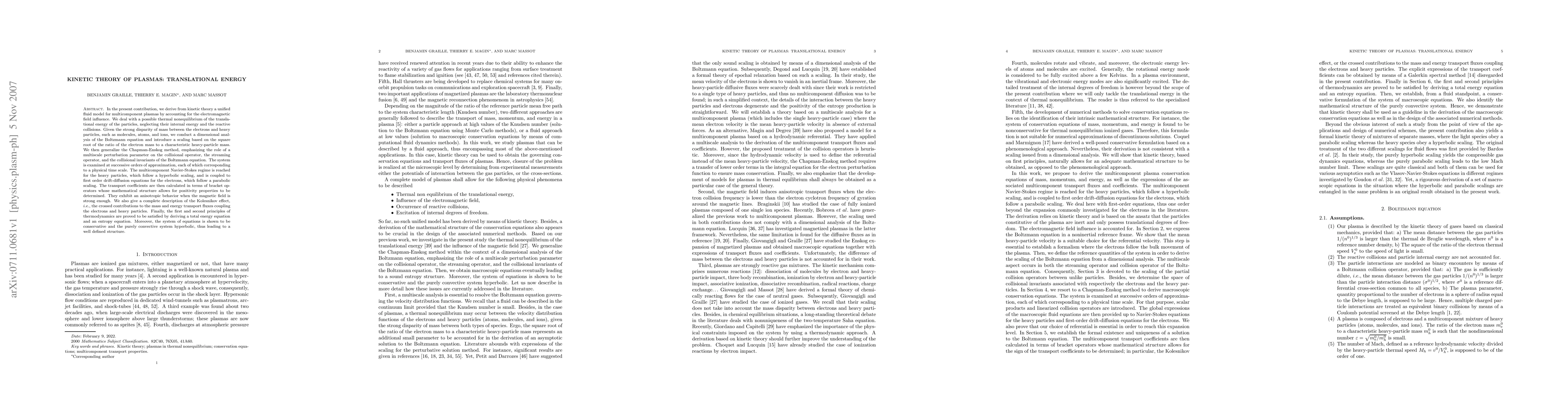 In the present contribution, we derive from kinetic theory a unified fluid model for multicomponent plasmas by accounting for the electromagnetic field influence. We deal with a possible thermal nonequilibrium of the translational energy of the particles, neglecting their internal energy and the reactive collisions. Given the strong disparity of mass between the electrons and heavy particles, such as molecules, atoms, and ions, we conduct a dimensional analysis of the Boltzmann equation. We then generalize the Chapman-Enskog method, emphasizing the role of a multiscale perturbation parameter on the collisional operator, the streaming operator, and the collisional invariants of the Boltzmann equation. The system is examined at successive orders of approximation, each of which corresponding to a physical time scale. The multicomponent Navier-Stokes regime is reached for the heavy particles, which follow a hyperbolic scaling, and is coupled to first order drift-diffusion equations for the electrons, which follow a parabolic scaling. The transport coefficients exhibit an anisotropic behavior when the magnetic field is strong enough. We also give a complete description of the Kolesnikov effect, i.e., the crossed contributions to the mass and energy transport fluxes coupling the electrons and heavy particles. Finally, the first and second principles of thermodynamics are proved to be satisfied by deriving a total energy equation and an entropy equation. Moreover, the system of equations is shown to be conservative and the purely convective system hyperbolic, thus leading to a well-defined structure.