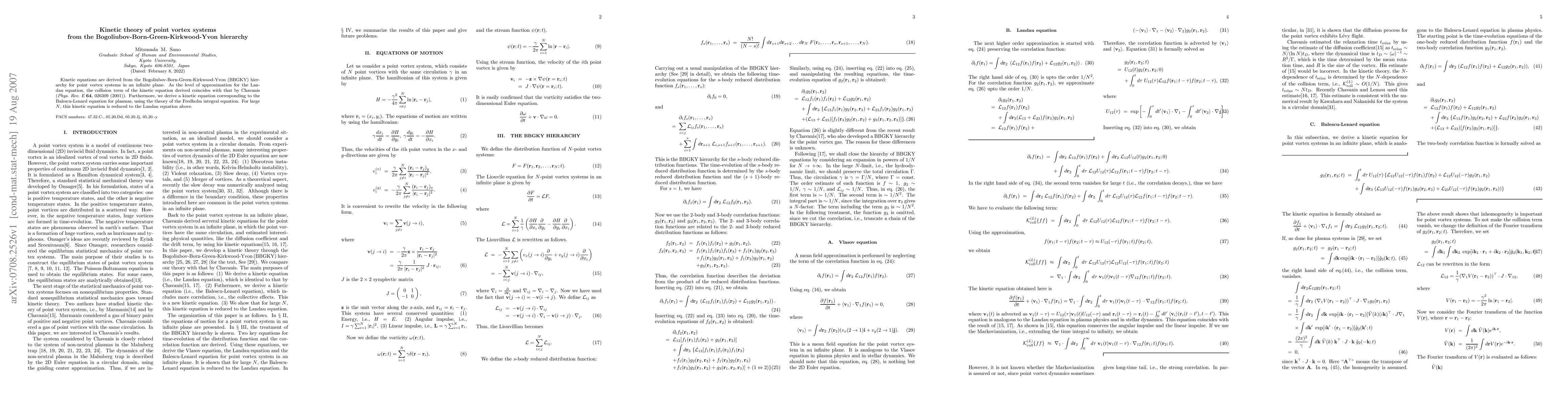 Kinetic equations are derived from the Bogoliubov-Born-Green-Kirkwood-Yvon (BBGKY) hierarchy for point vortex systems in an infinite plane. As the level of approximation for the Landau equation, the collision term of the kinetic equation derived coincides with that by Chavanis ({\it Phys. Rev. E} {\bf 64}, 026309 (2001)). Furthermore, we derive a kinetic equation corresponding to the Balescu-Lenard equation for plasmas, using the theory of the Fredholm integral equation. For large $N$, this kinetic equation is reduced to the Landau equation above.