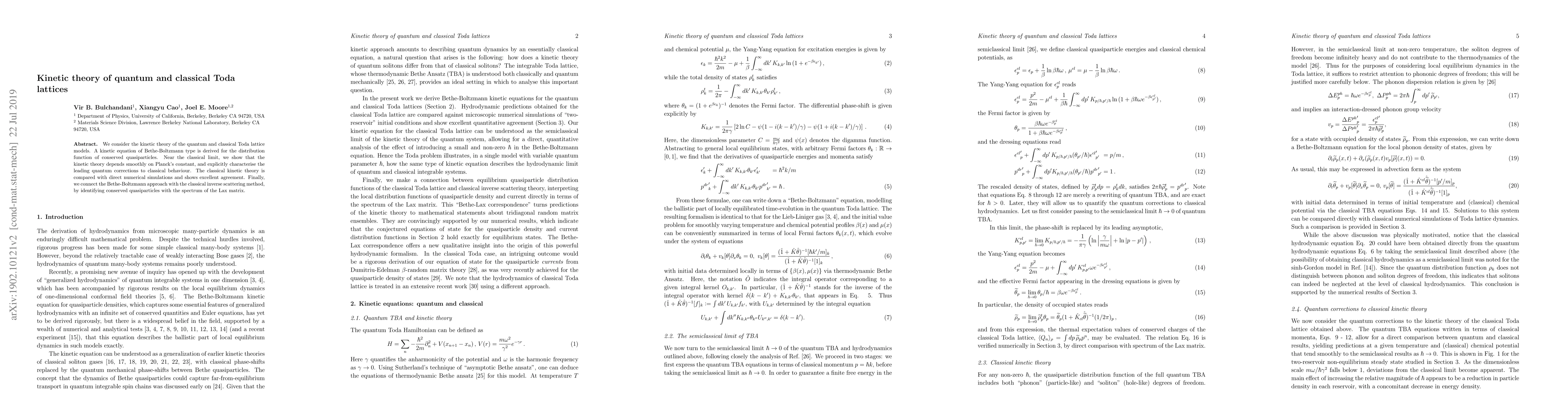 This paper develops a kinetic theory for quantum and classical Toda lattice models, deriving a Bethe-Boltzmann-type equation for quasiparticle distribution functions. It demonstrates smooth transition from quantum to classical behavior and identifies leading quantum corrections, showing excellent agreement with numerical simulations.