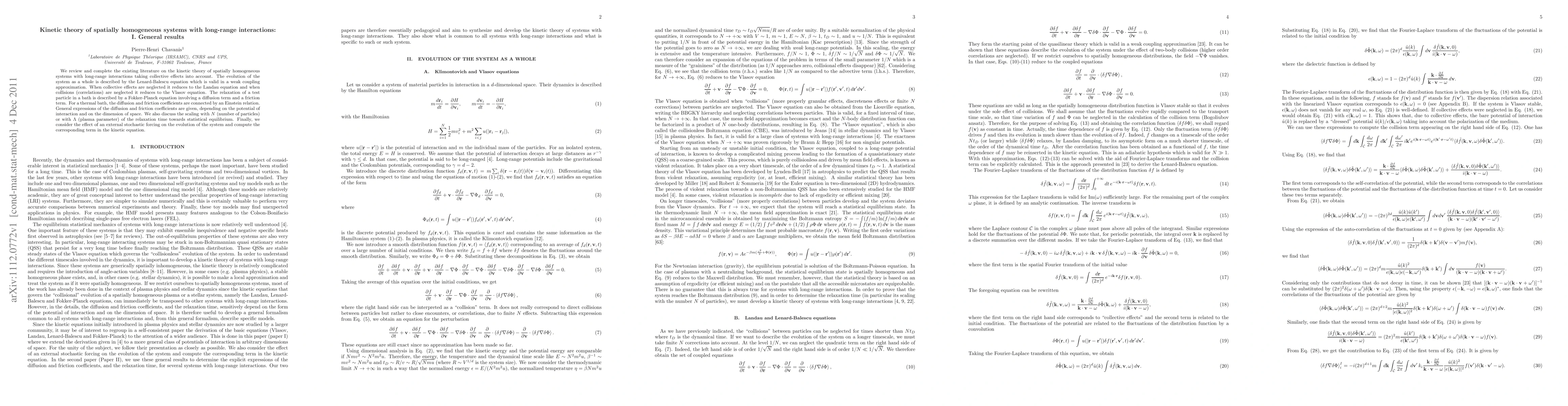 This paper reviews the kinetic theory for spatially homogeneous systems with long-range interactions, focusing on the Lenard-Balescu equation in weak coupling. It provides general expressions for the diffusion and friction coefficients, discusses their dependence on interaction potential and spatial dimension, and examines the scaling of relaxation times with particle number and plasma parameter.