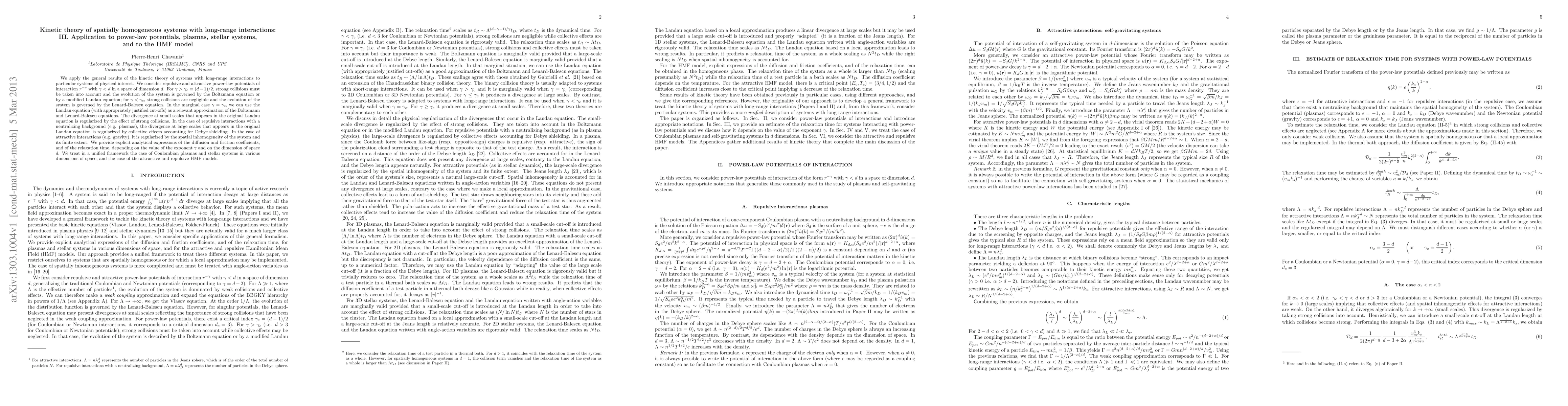 This research applies kinetic theory to spatially homogeneous systems with long-range interactions, focusing on power-law potentials like plasmas and stellar systems. It identifies conditions under which the Boltzmann, Landau, or Lenard-Balescu equations govern system evolution, regularizing divergenges via strong collisions, collective effects, or spatial inhomogeneity. The study provides explicit expressions for diffusion, friction coefficients, and relaxation time, unifying the treatment of Coulombian plasmas, stellar systems, and HMF models.