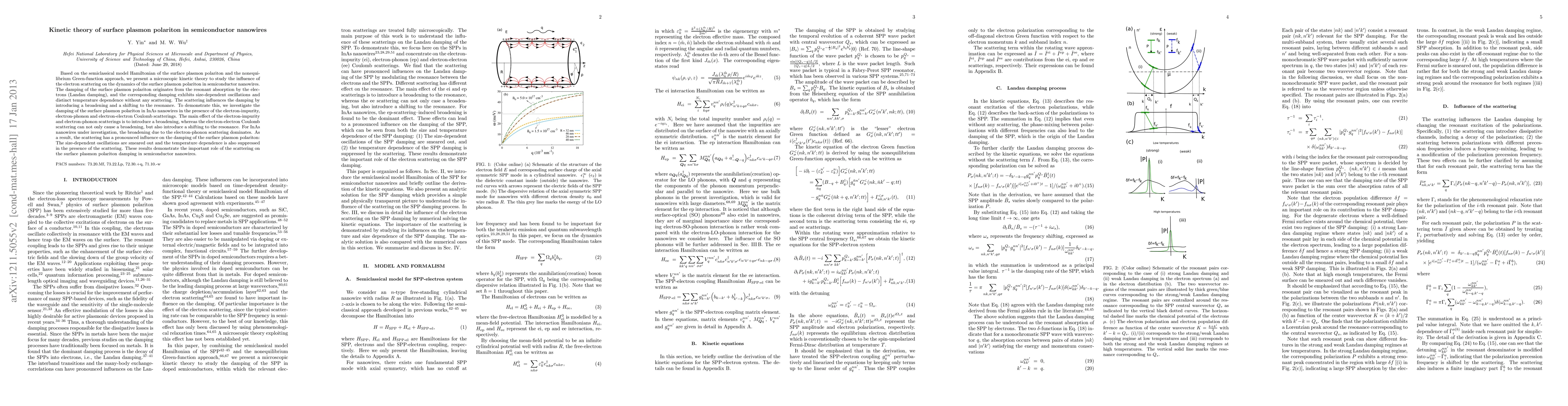 This paper develops a kinetic theory to study the damping of surface plasmon polaritons in semiconductor nanowires, revealing that electron scattering significantly influences damping through broadening and resonance shifting. The electron-phonon scattering primarily causes broadening, while electron-electron Coulomb scattering additionally shifts the resonance, leading to suppressed size-dependent oscillations and temperature dependence in InAs nanowires.